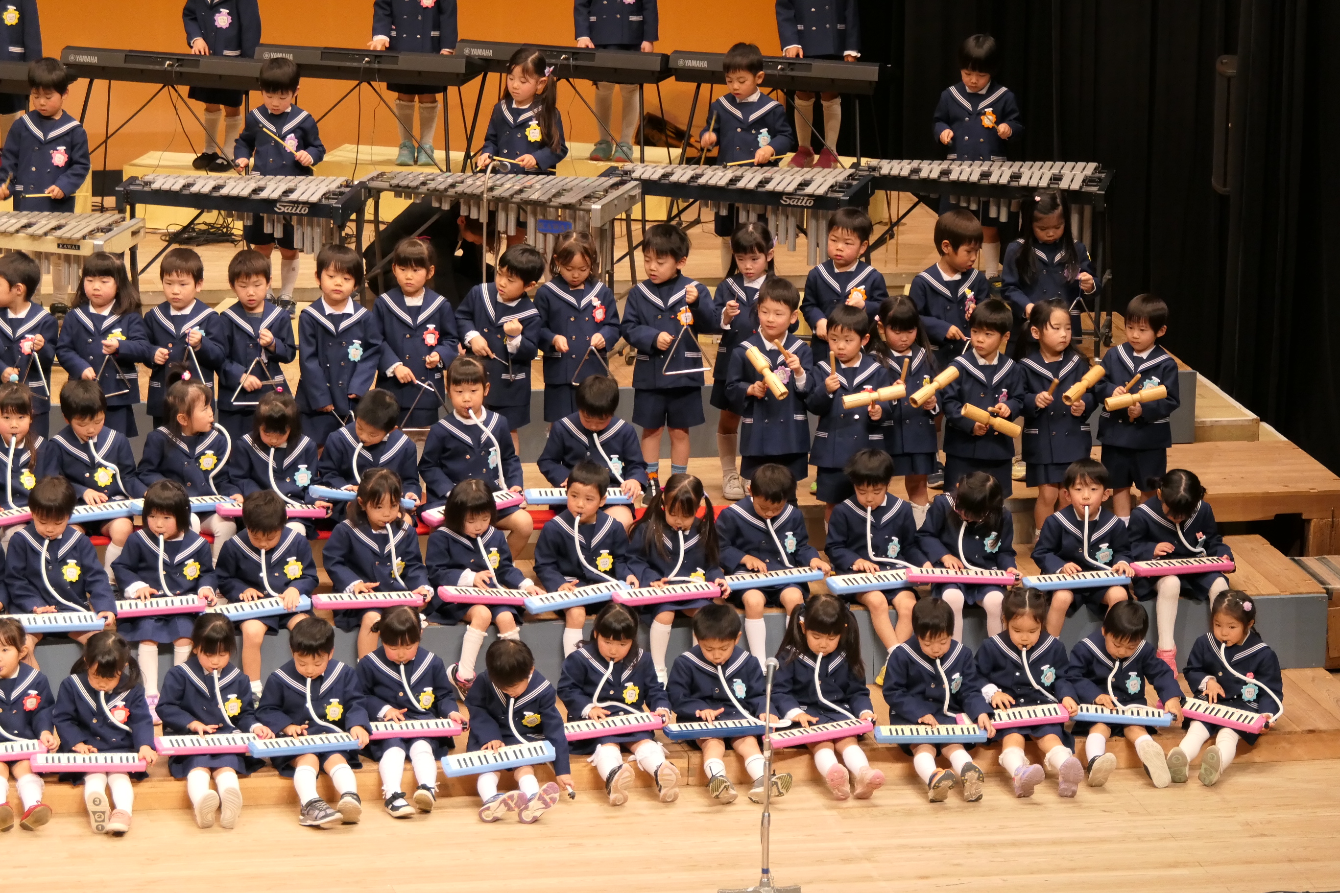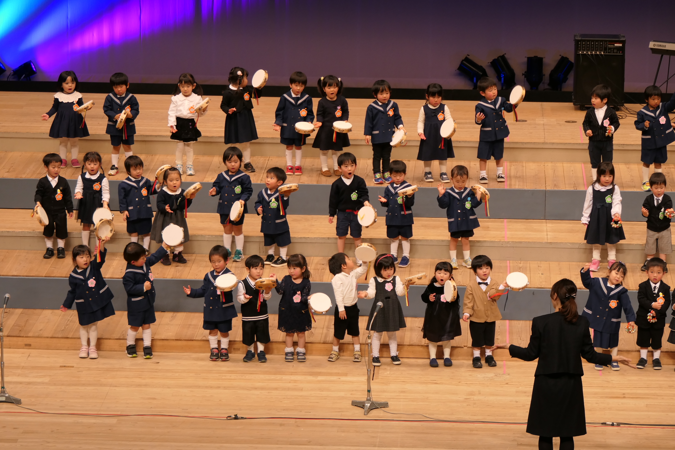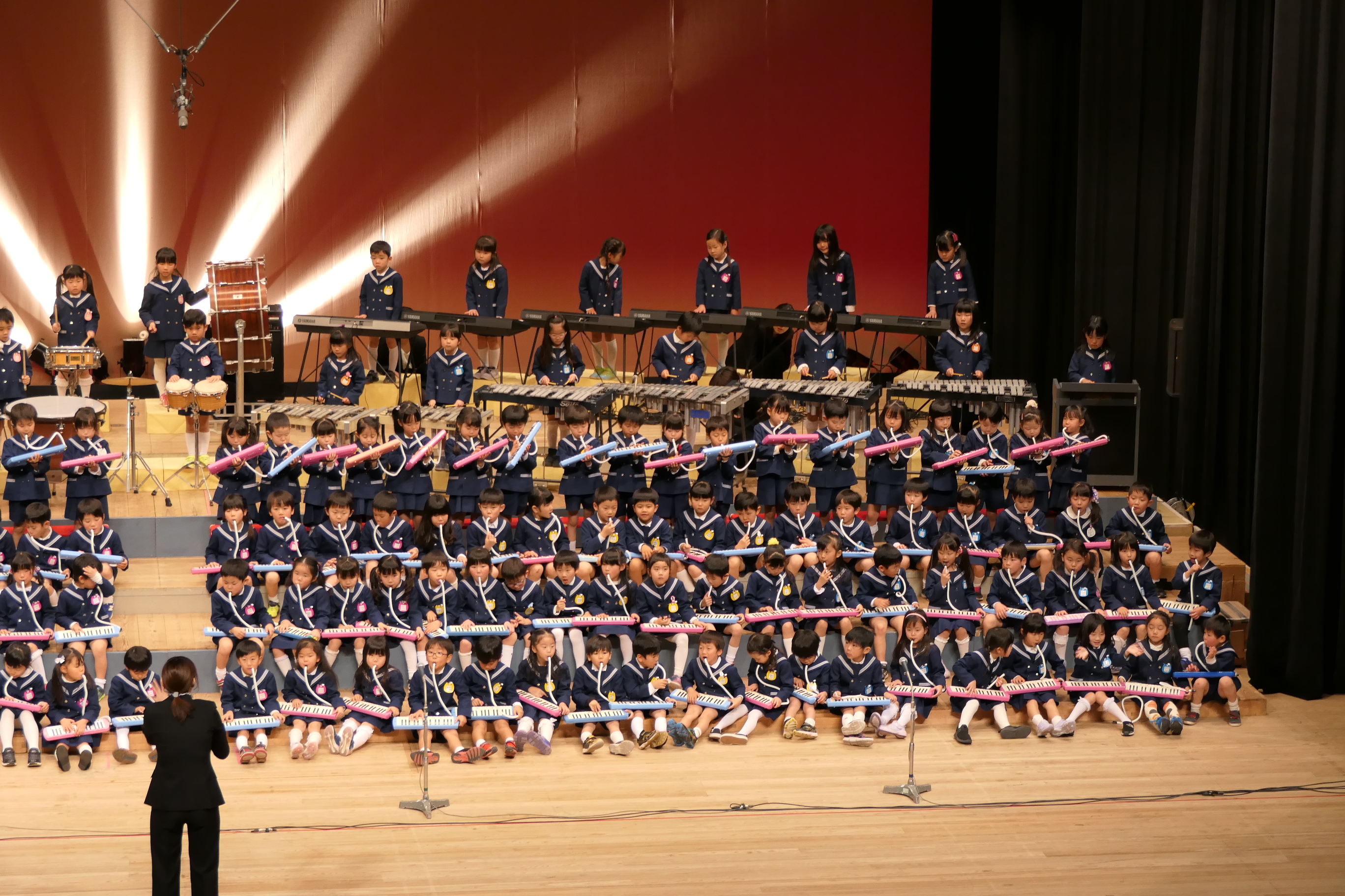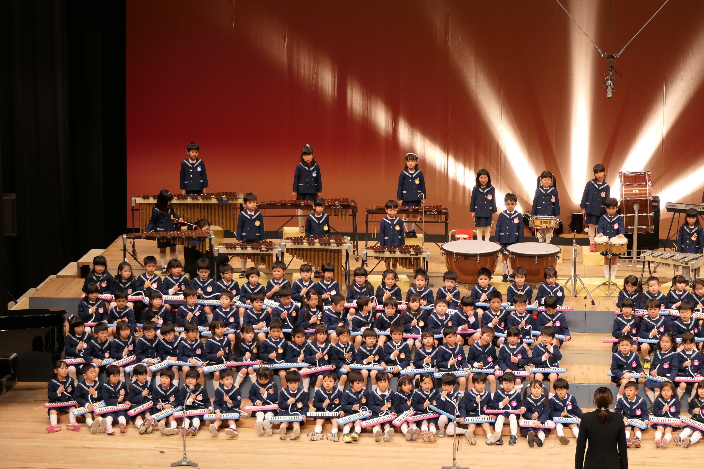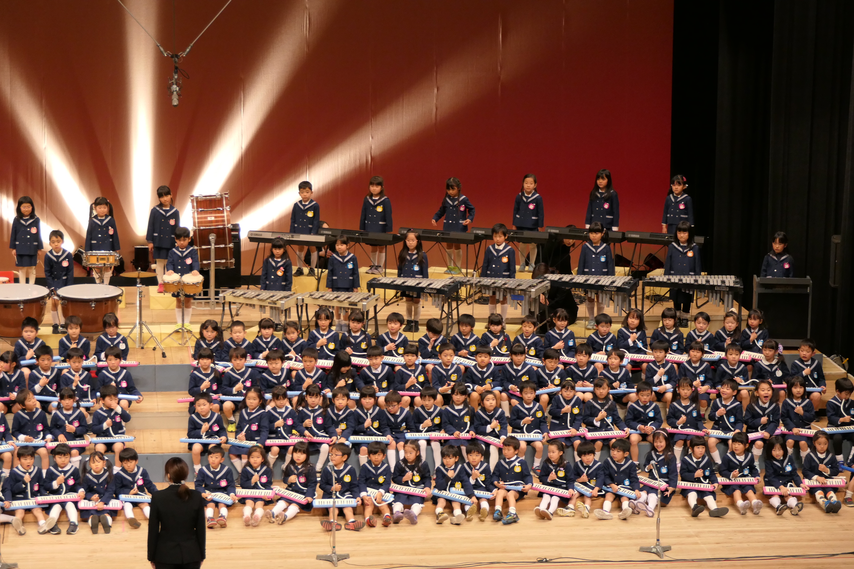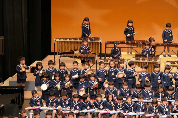市民会館の大ホールで、みんな元気いっぱい歌い、リズムをとり、楽器を演奏しました。ちょっぴり緊張したけど、楽しかった!