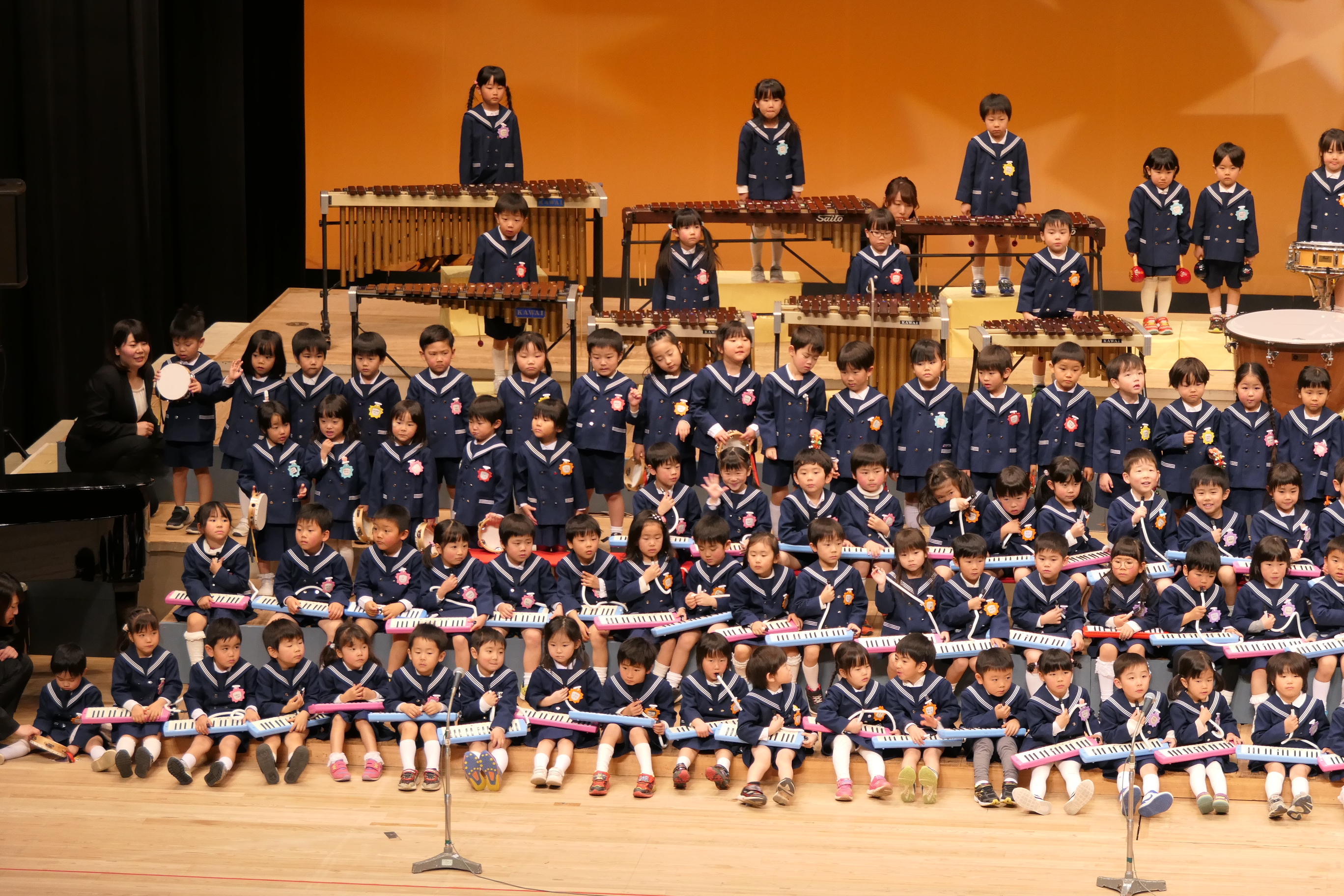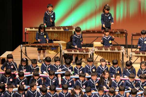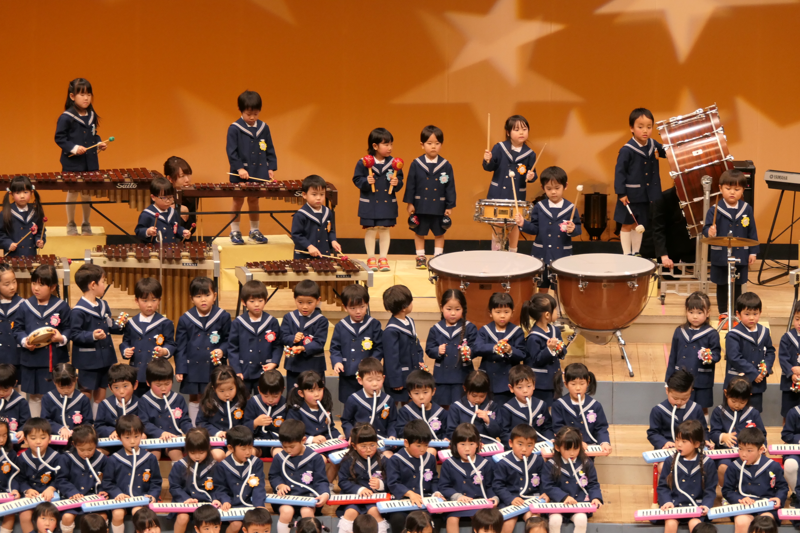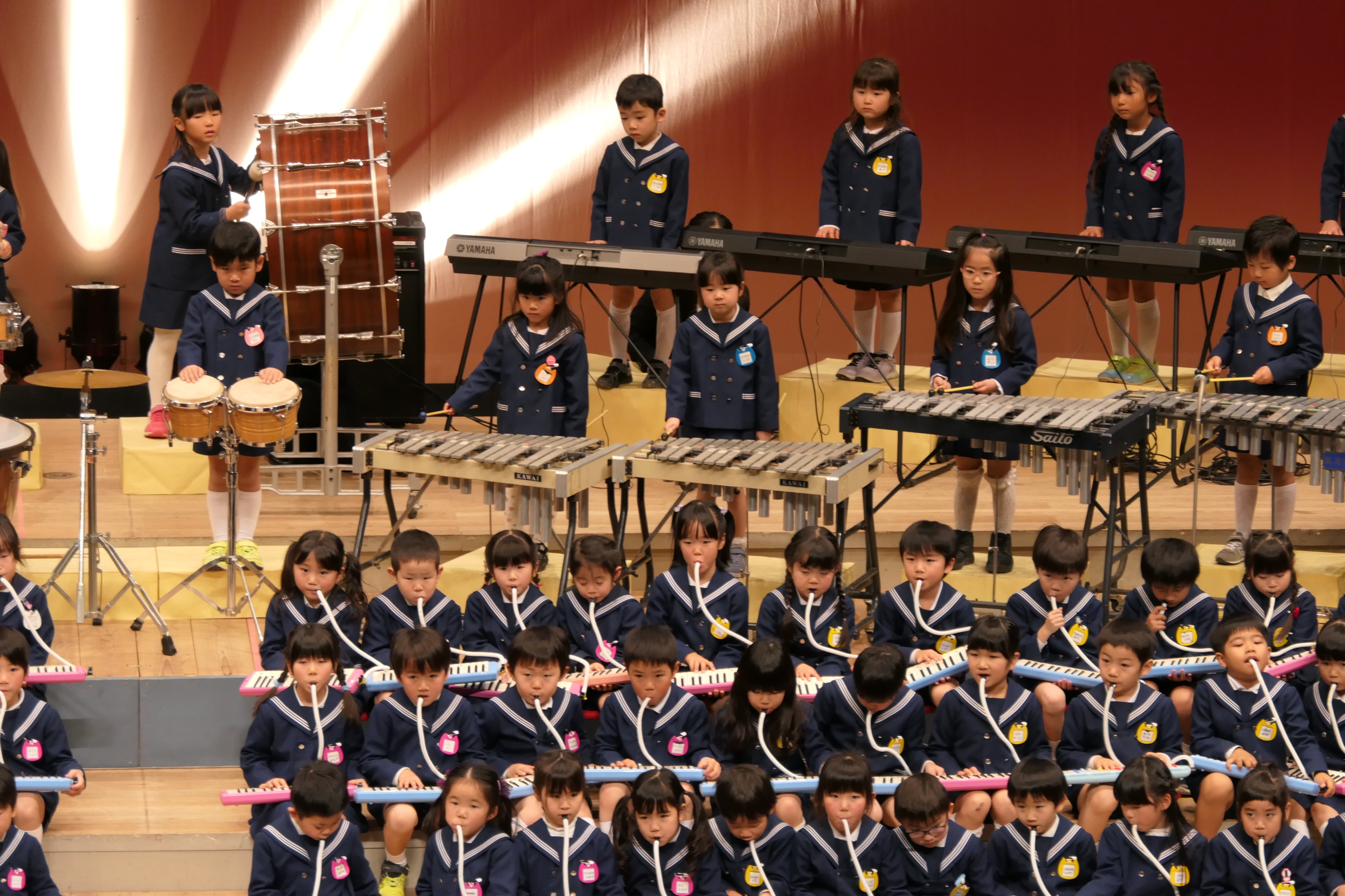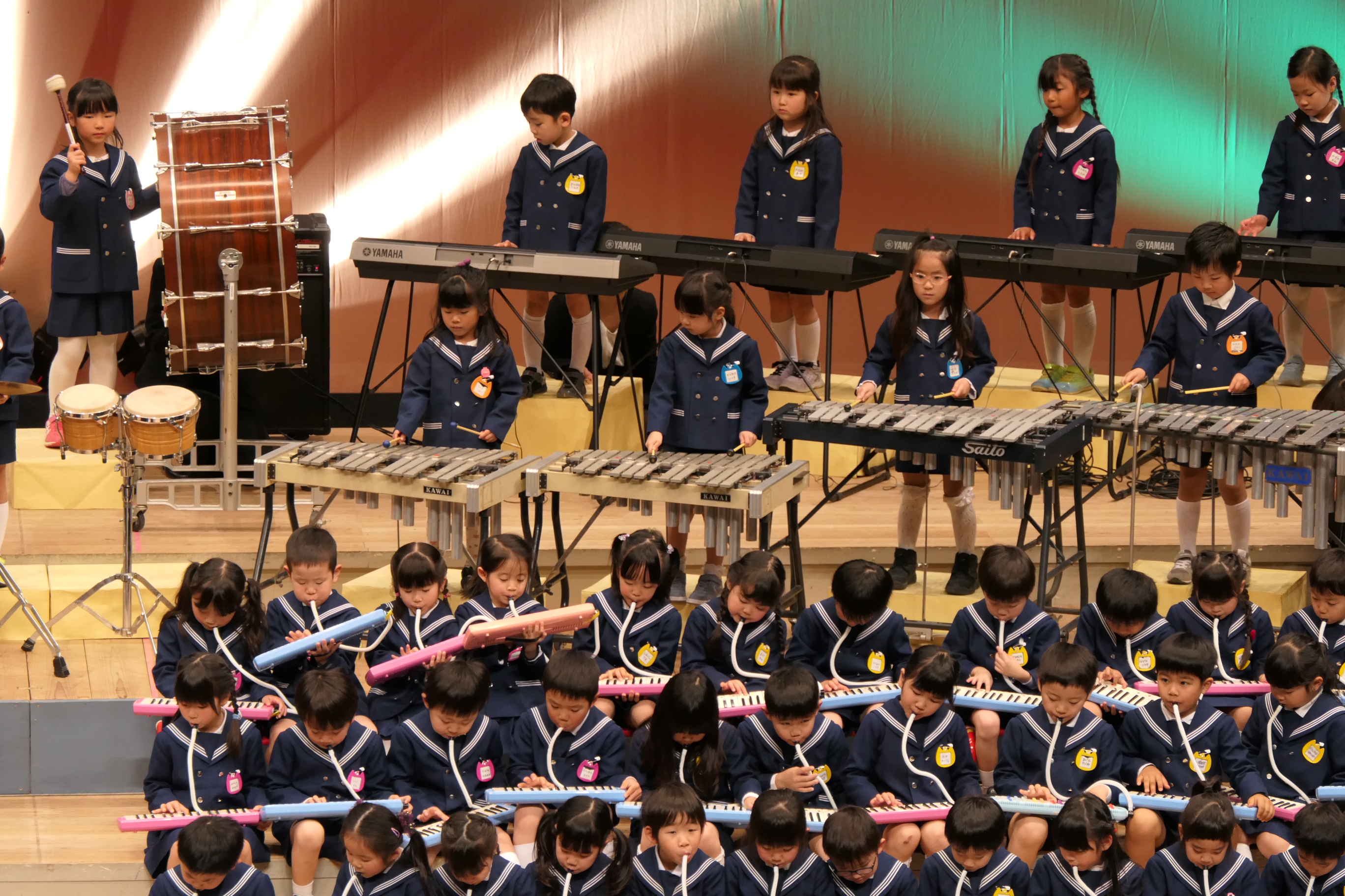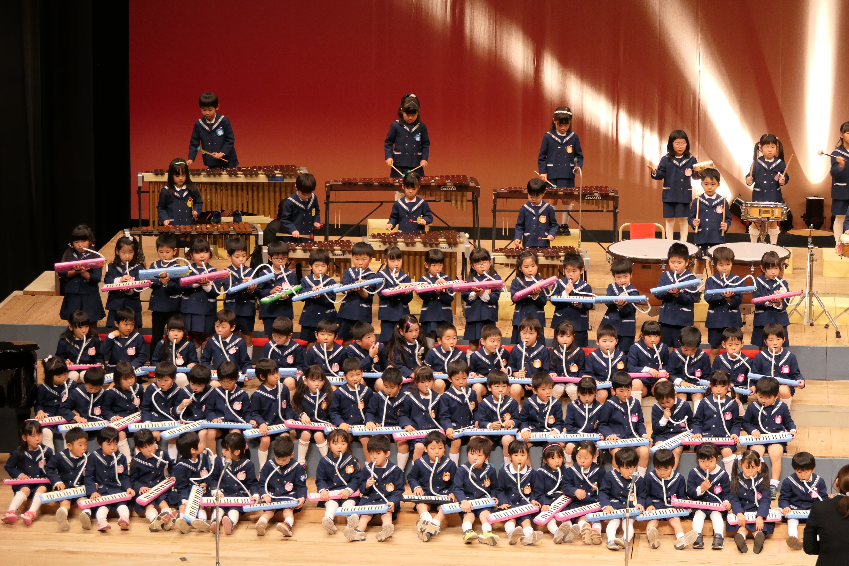 市民会館の大ホールで、みんな元気いっぱい歌い、リズムをとり、楽器を演奏しました。ちょっぴり緊張したけど、楽しかった!