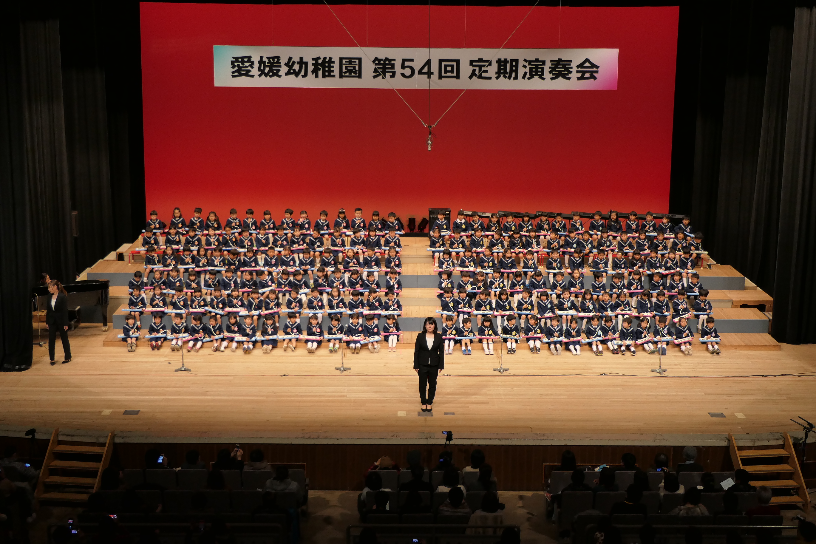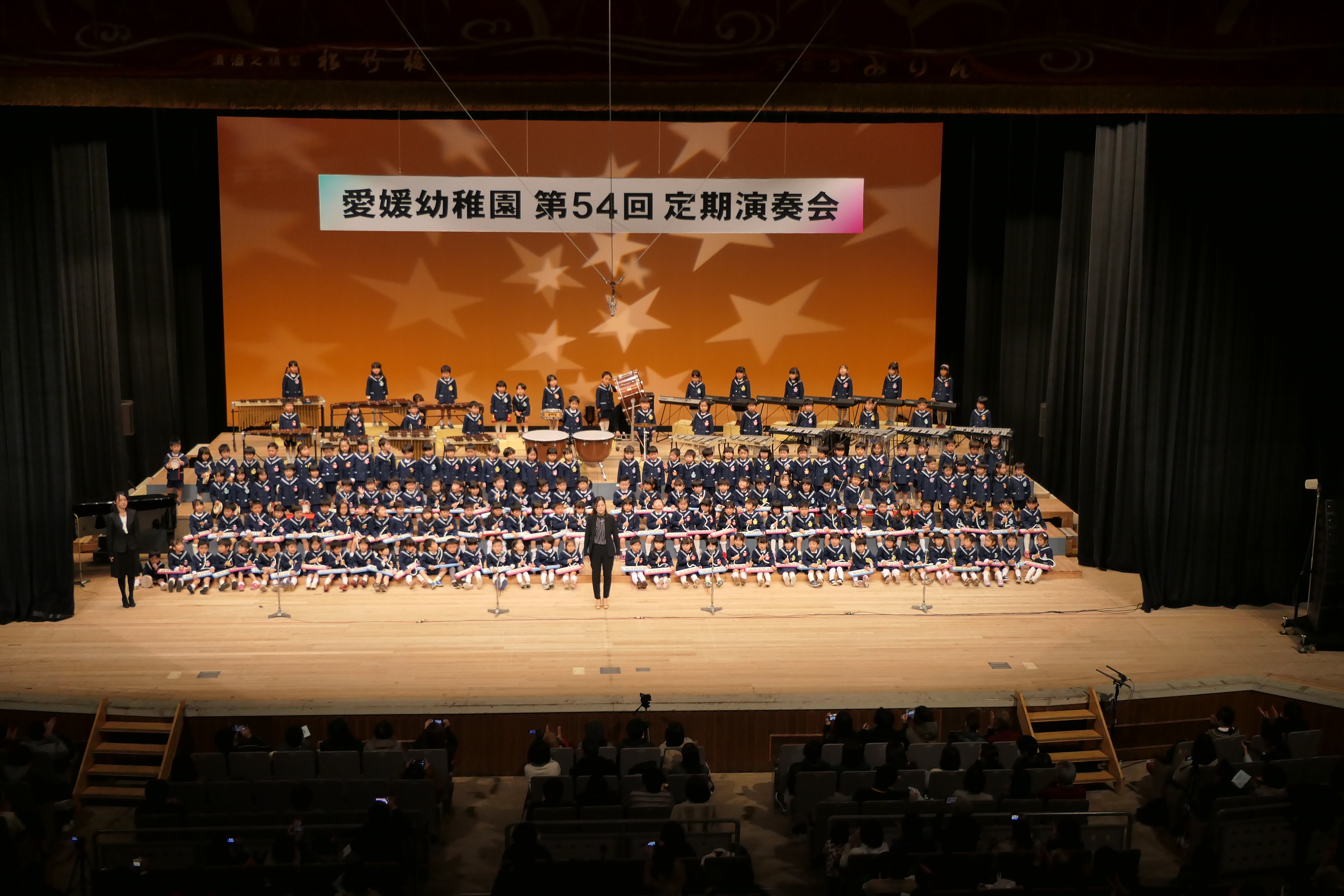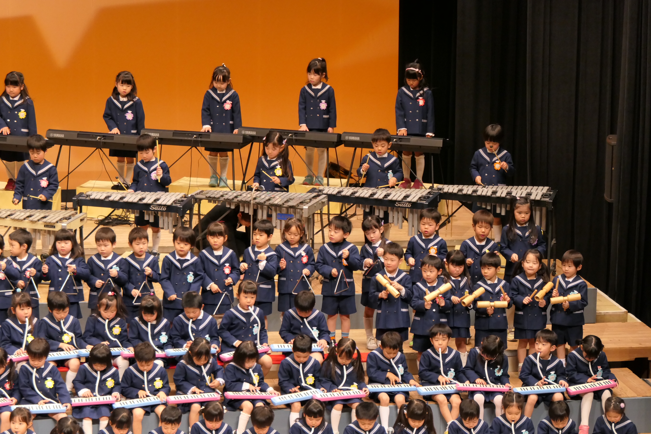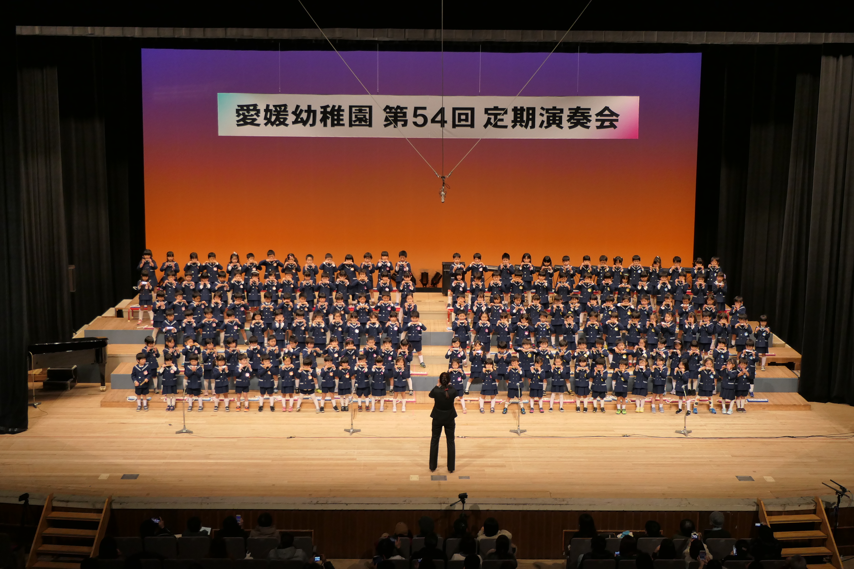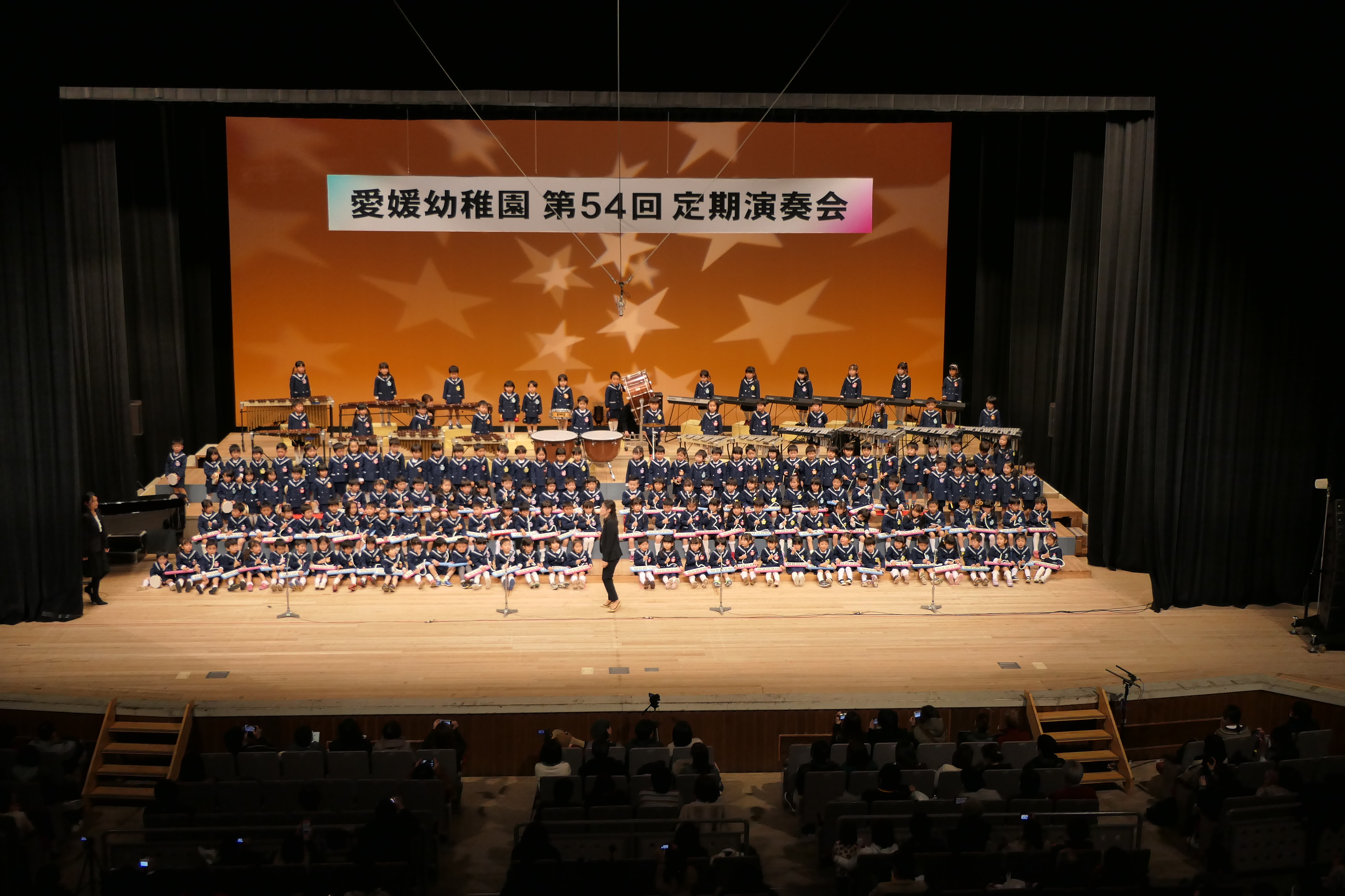 市民会館の大ホールで、みんな元気いっぱい歌い、リズムをとり、楽器を演奏しました。ちょっぴり緊張したけど、楽しかった!
