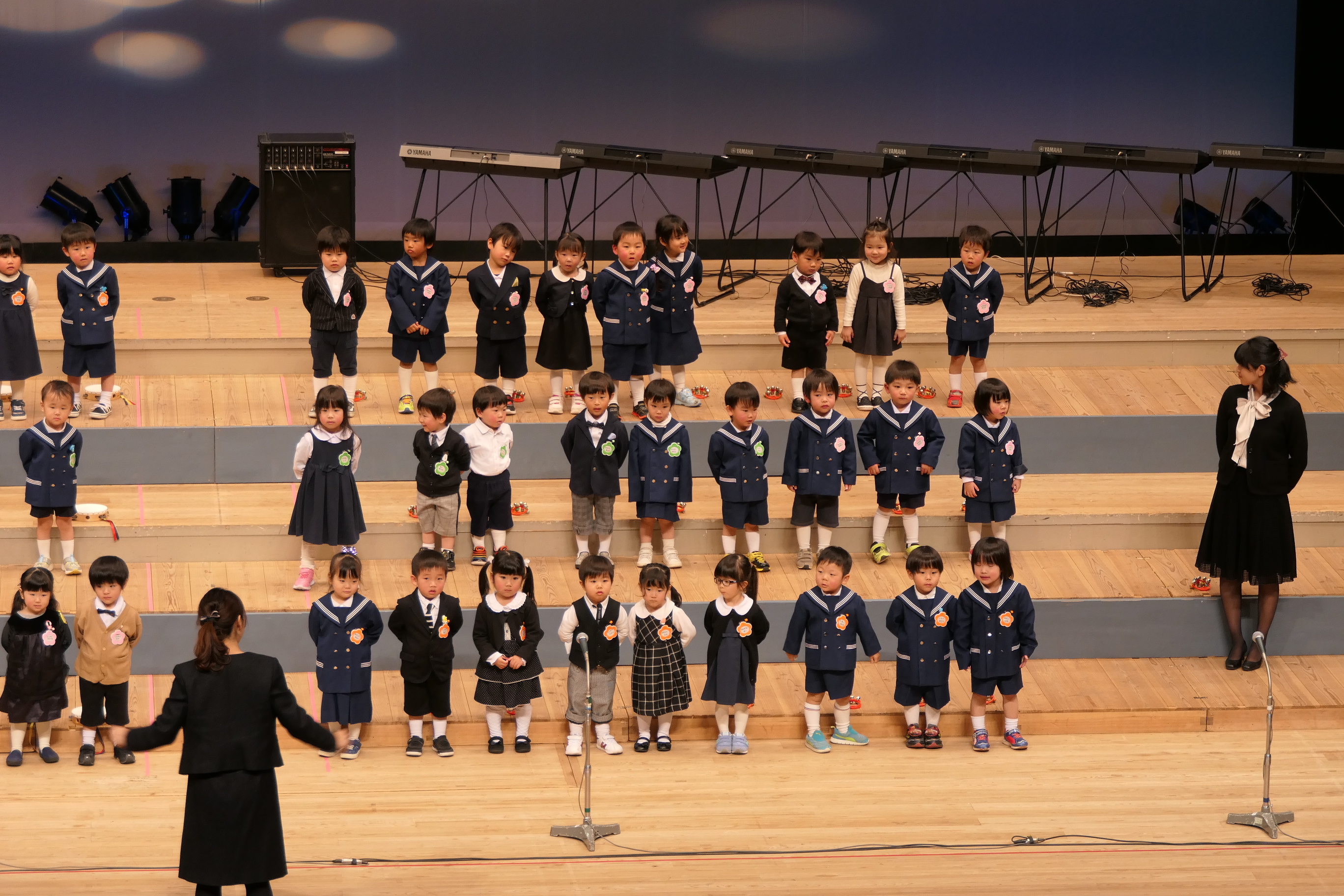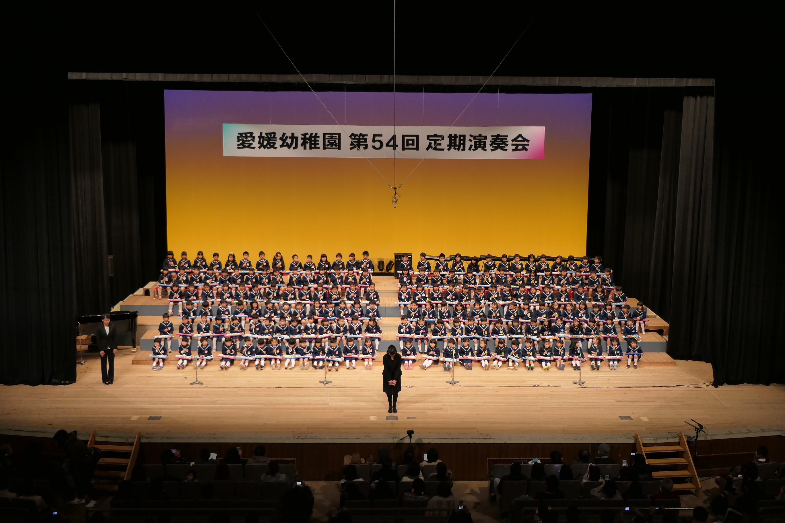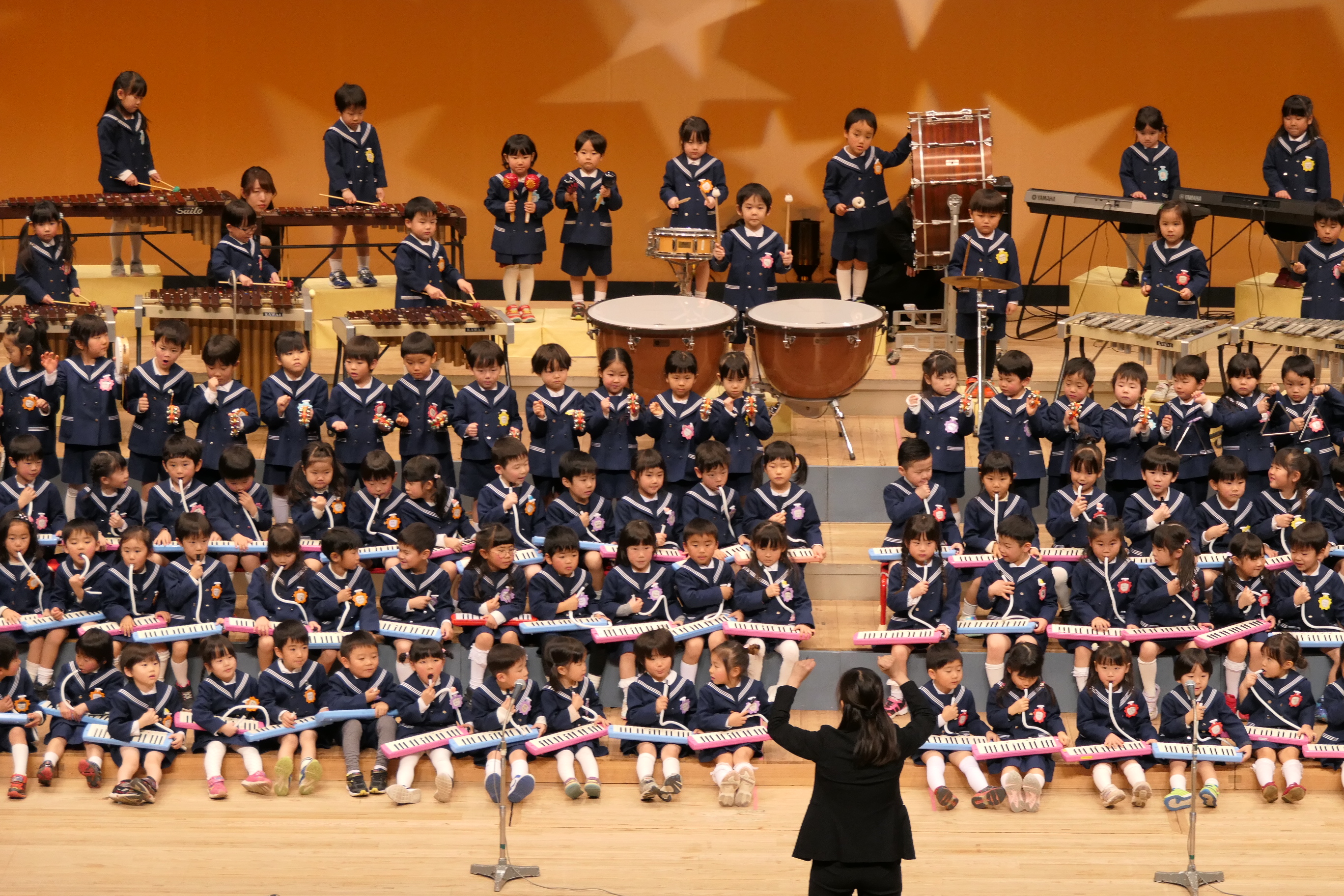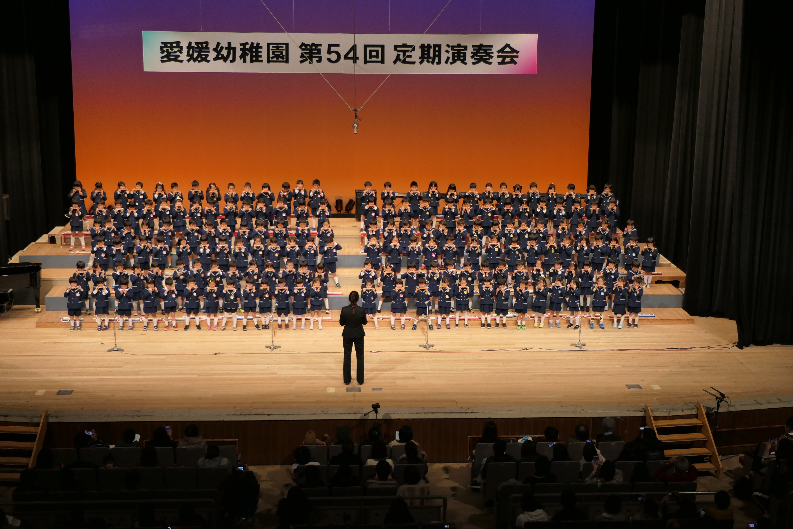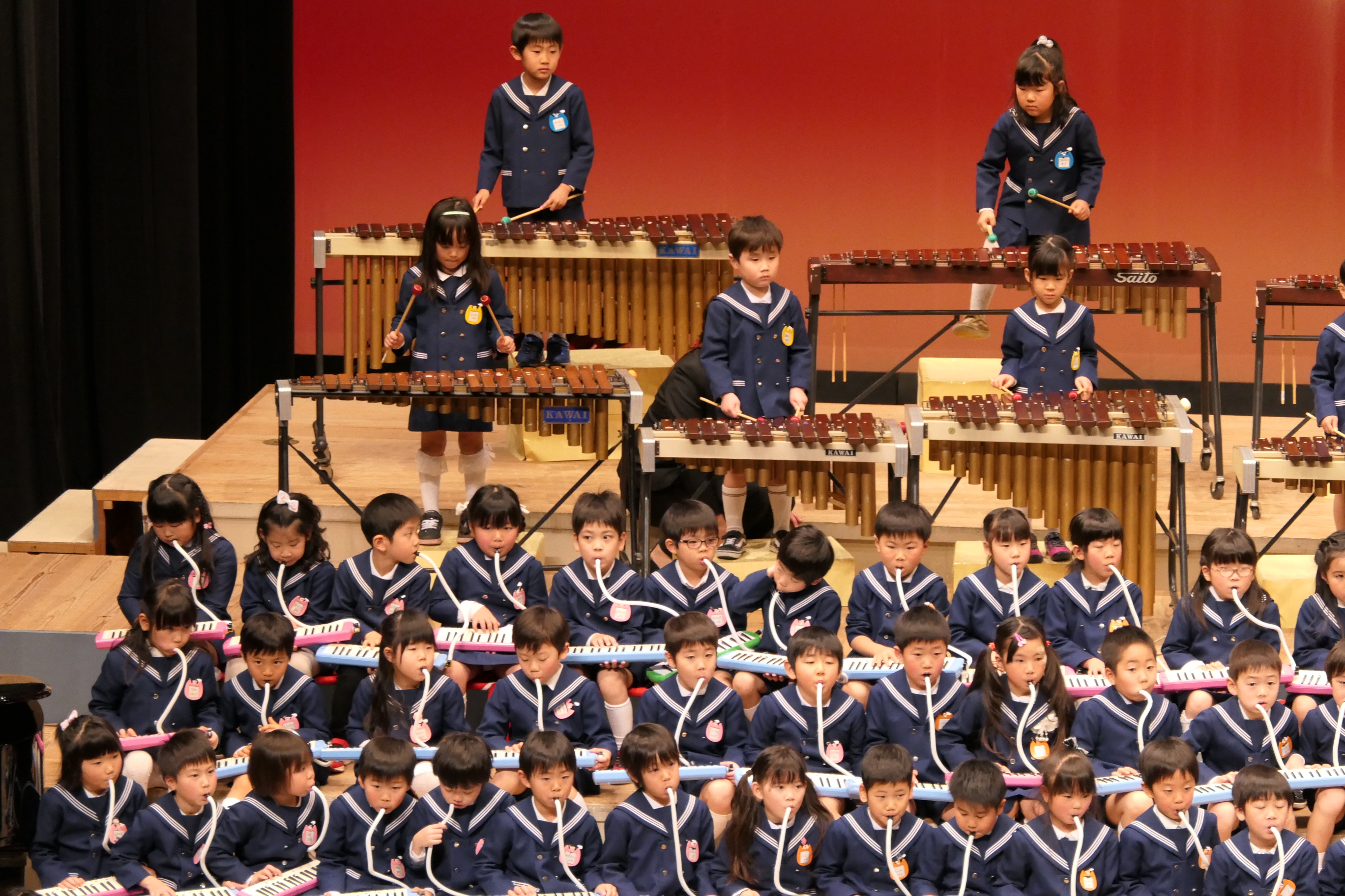 市民会館の大ホールで、みんな元気いっぱい歌い、リズムをとり、楽器を演奏しました。ちょっぴり緊張したけど、楽しかった!