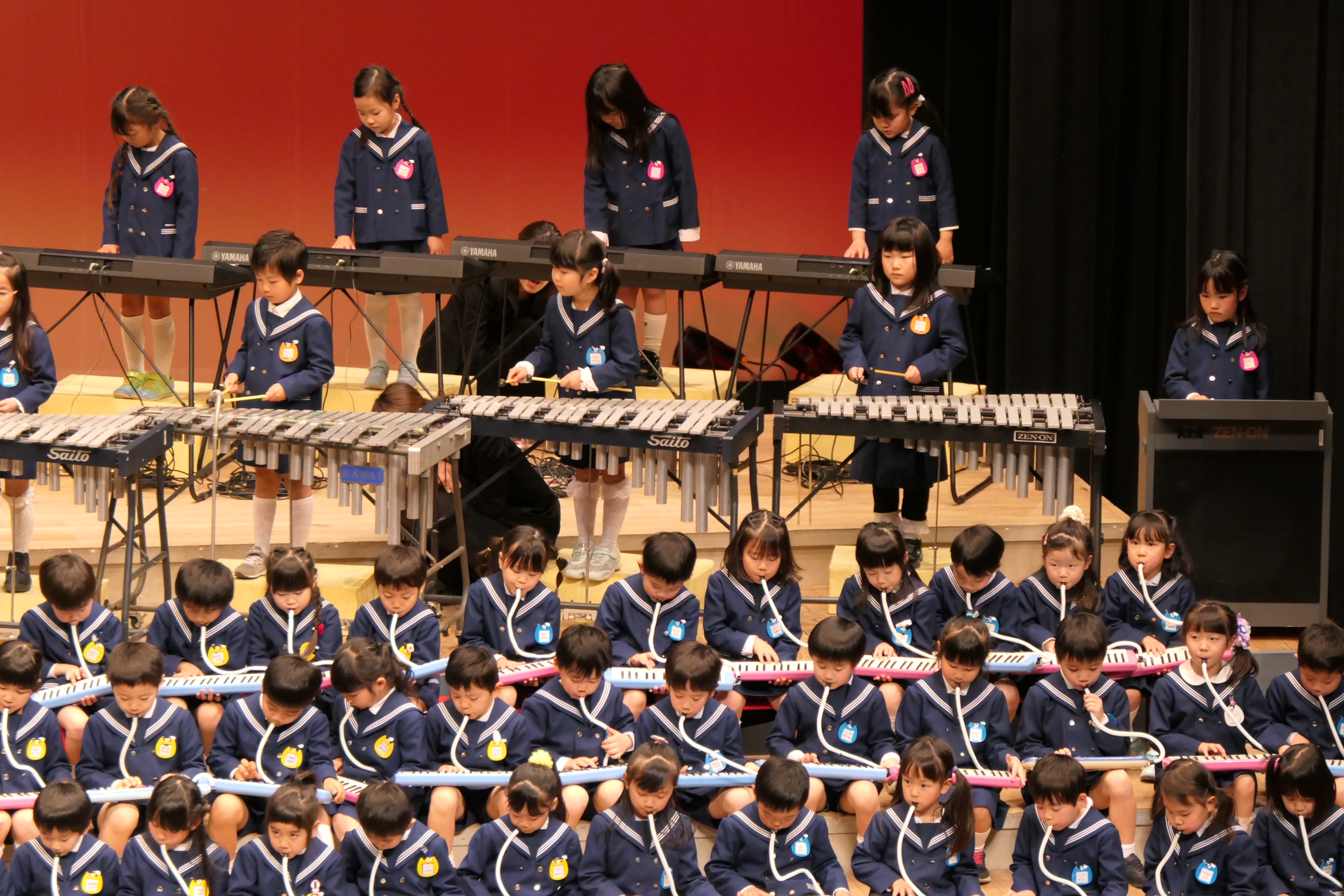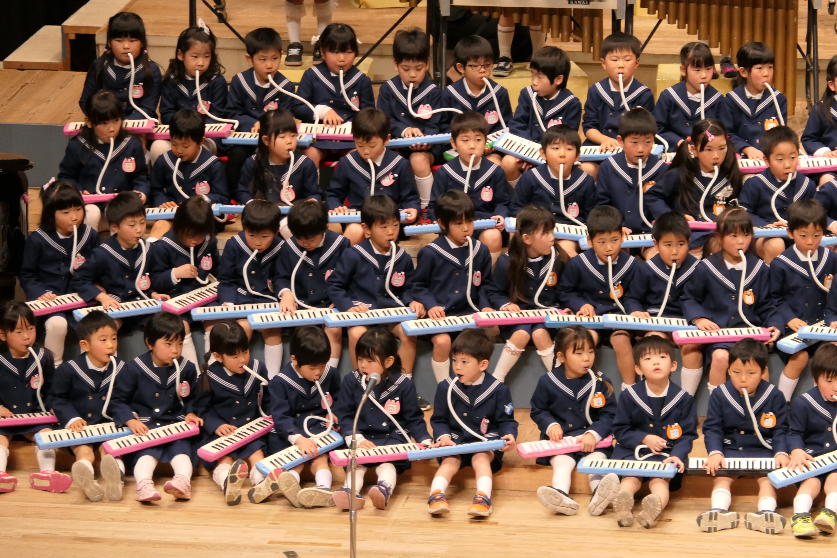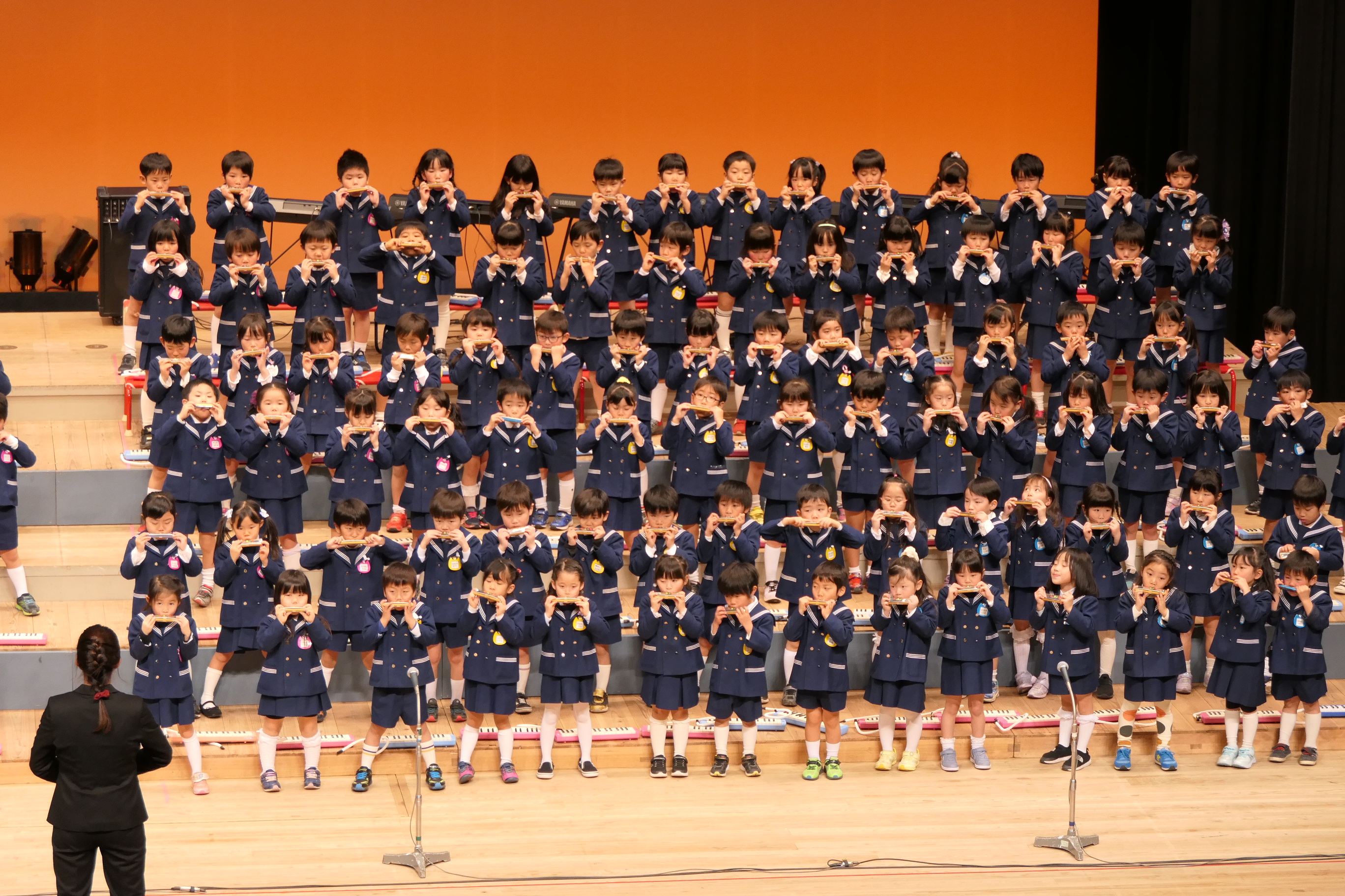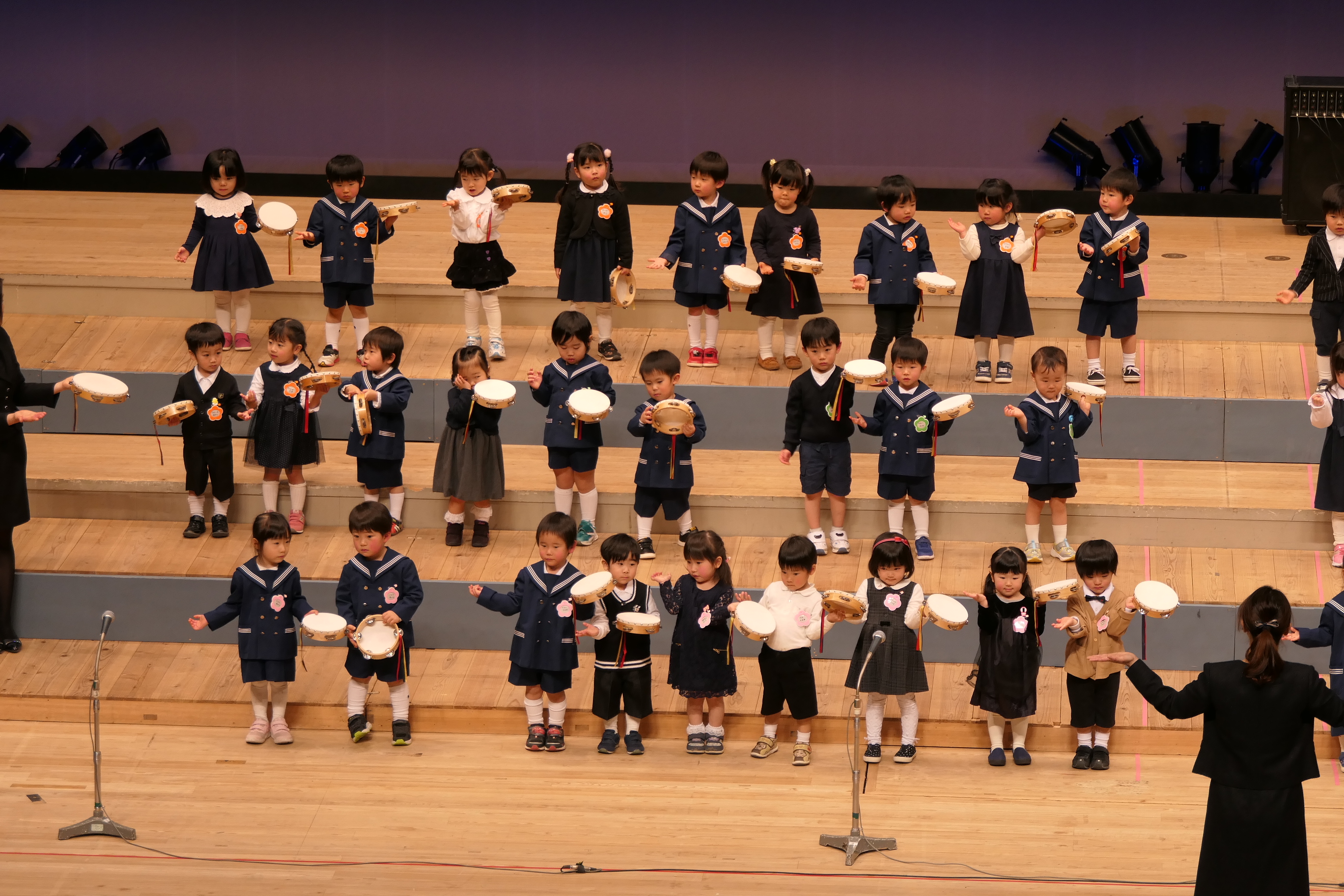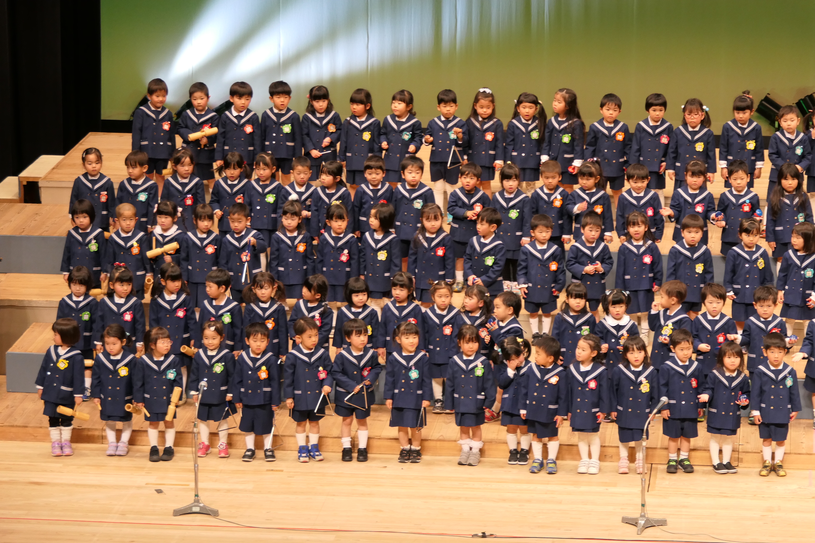 市民会館の大ホールで、みんな元気いっぱい歌い、リズムをとり、楽器を演奏しました。ちょっぴり緊張したけど、楽しかった!
