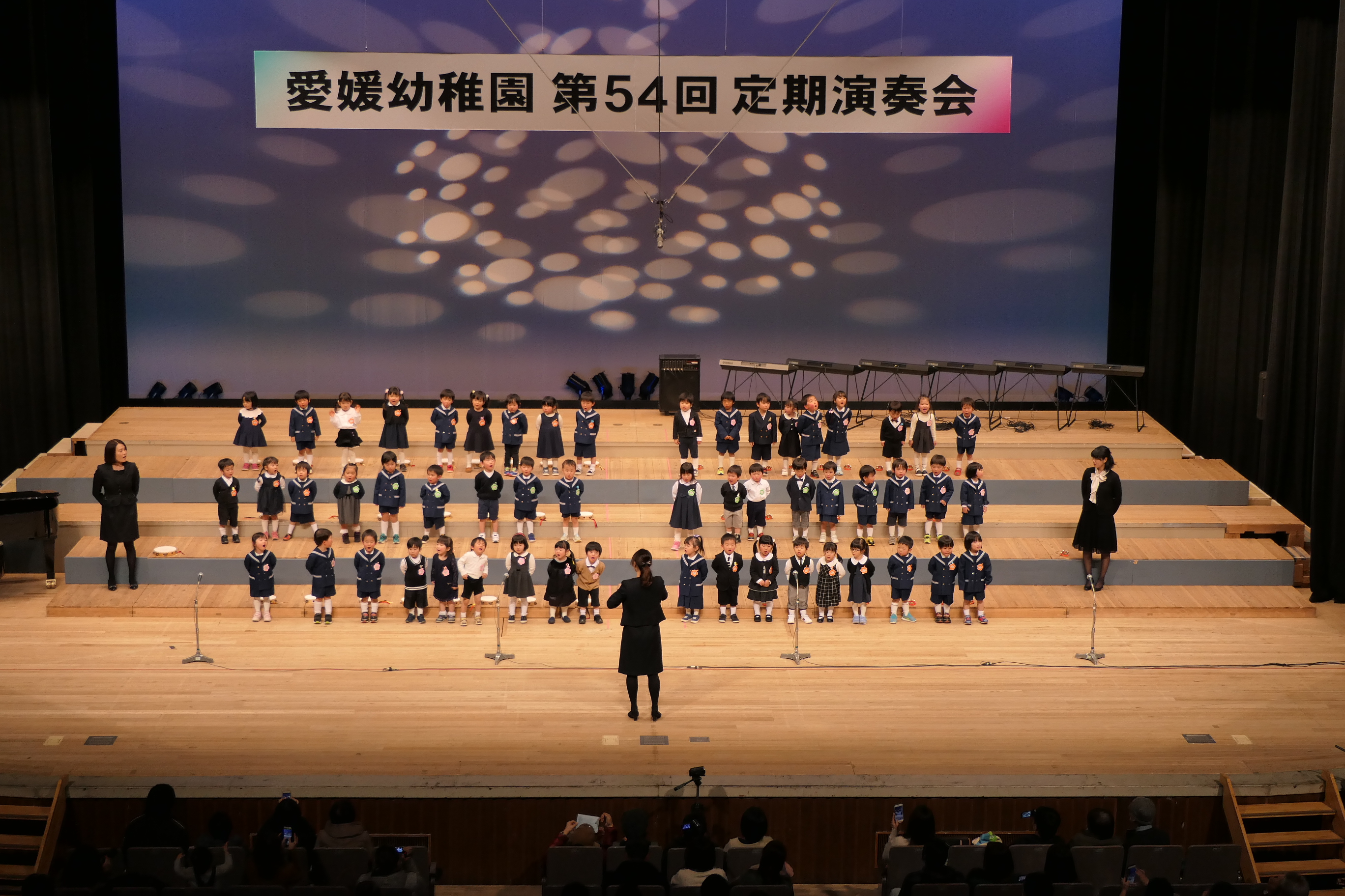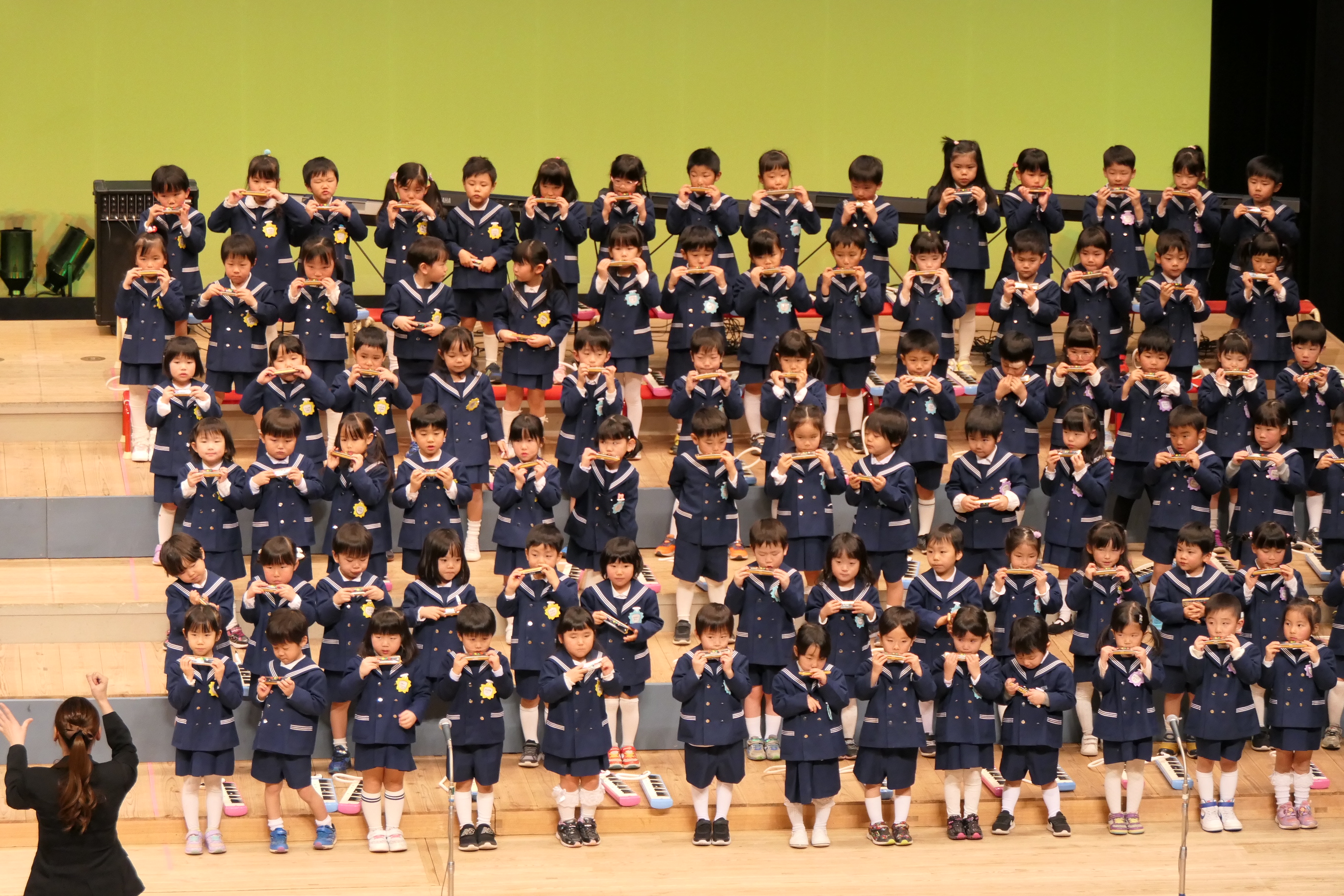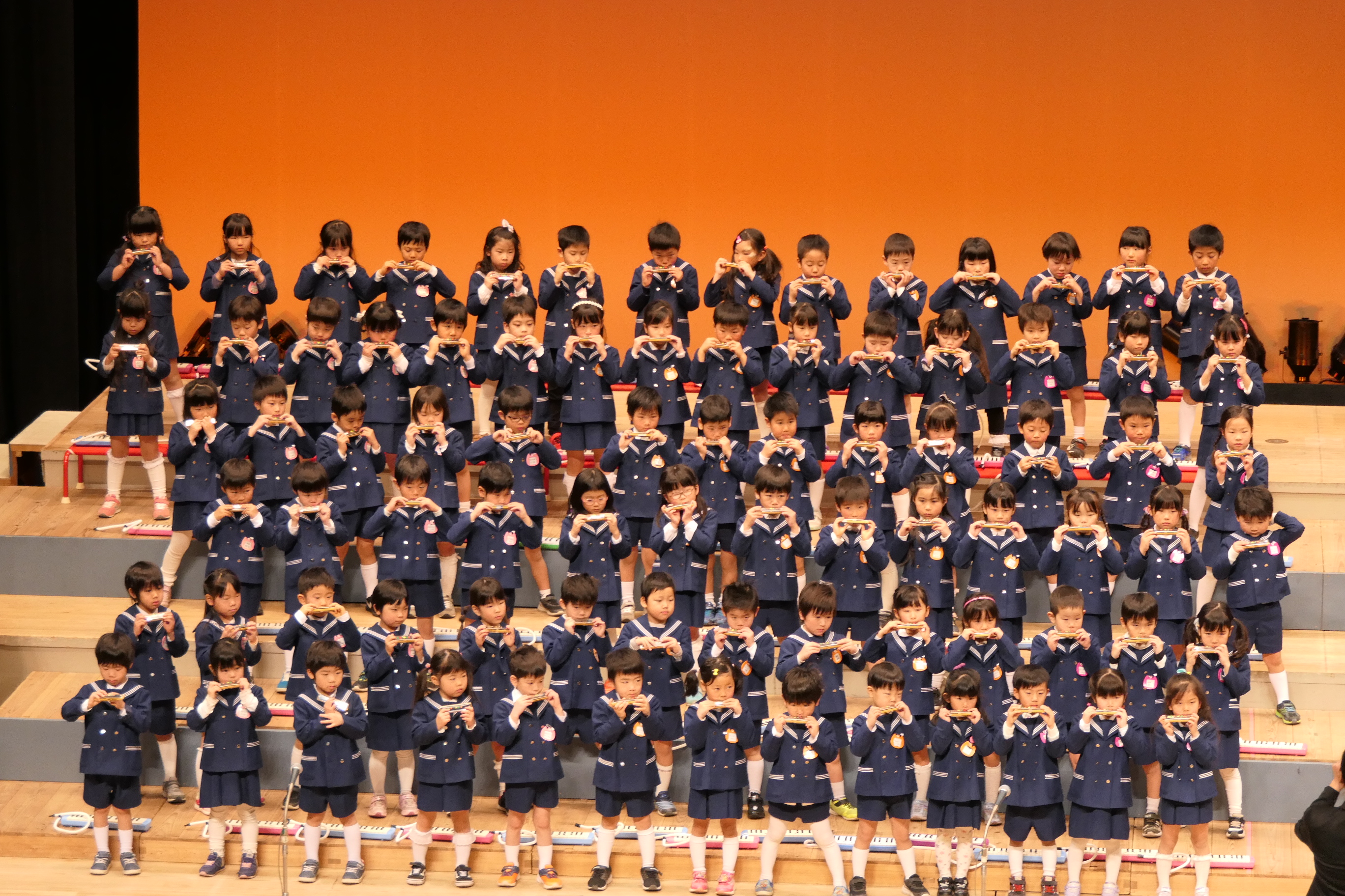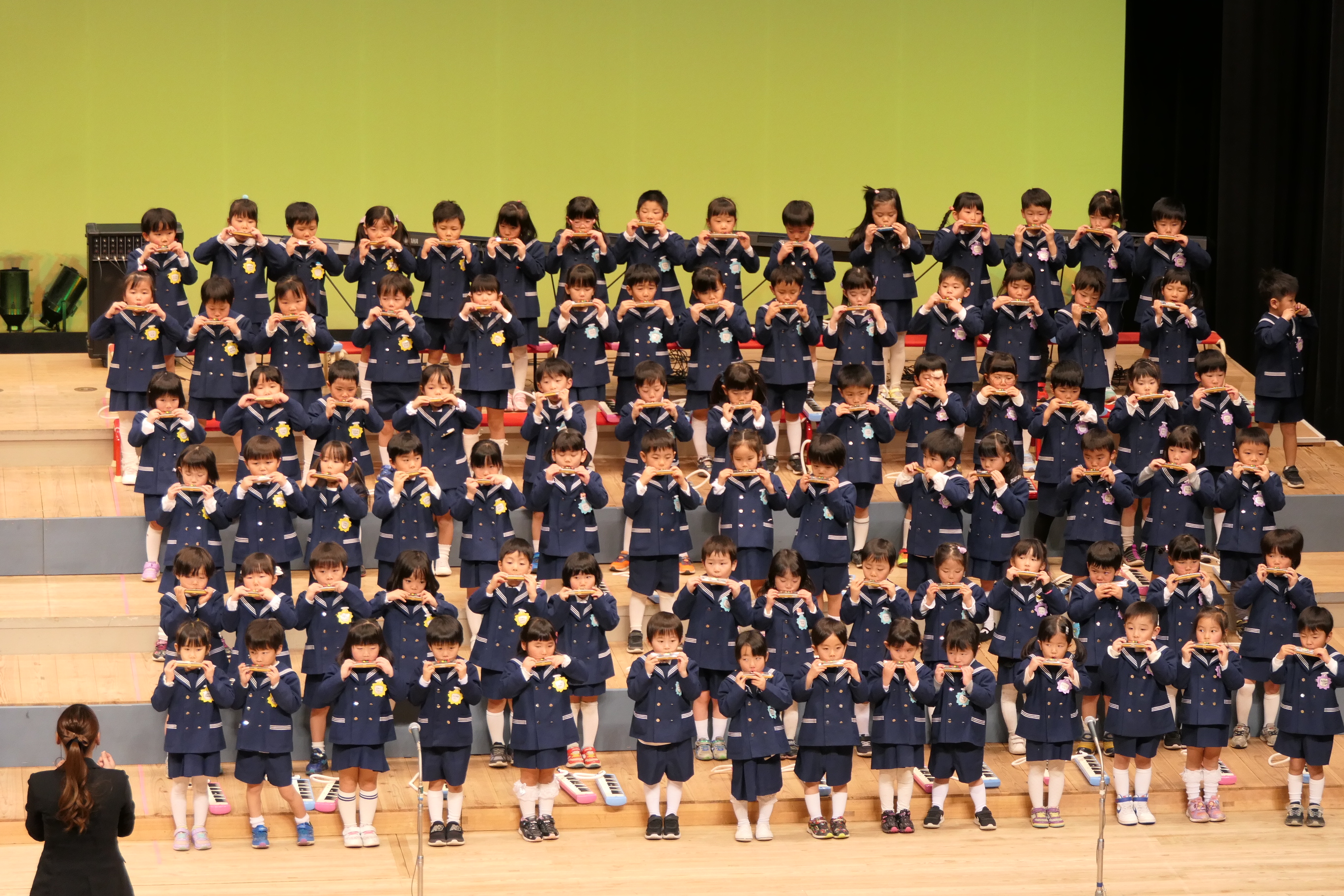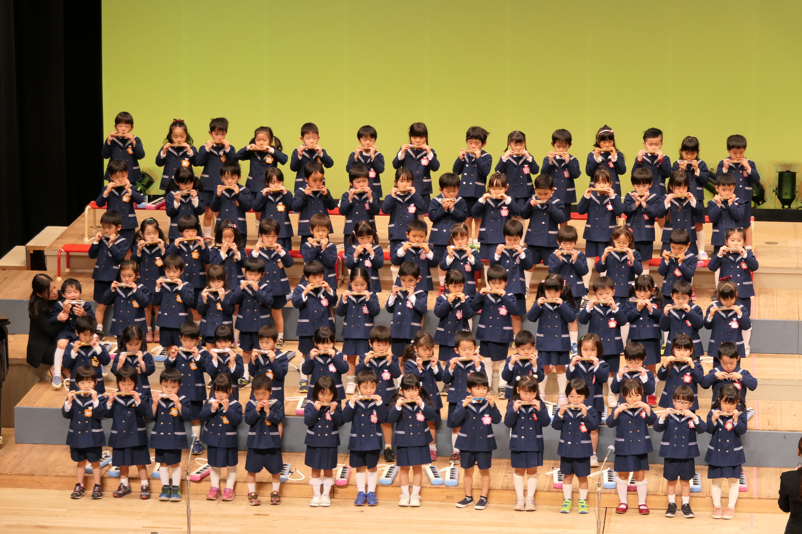 市民会館の大ホールで、みんな元気いっぱい歌い、リズムをとり、楽器を演奏しました。ちょっぴり緊張したけど、楽しかった!