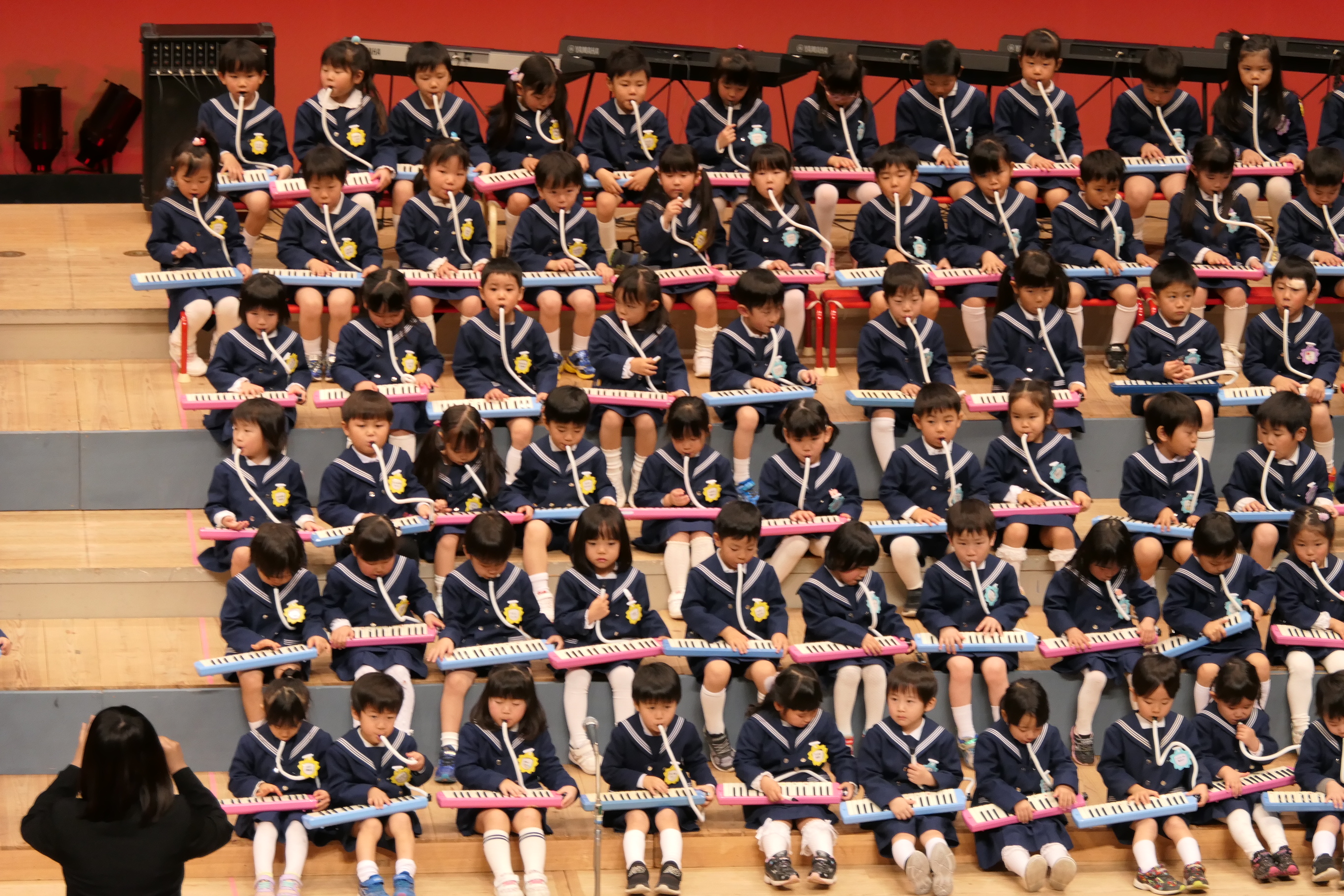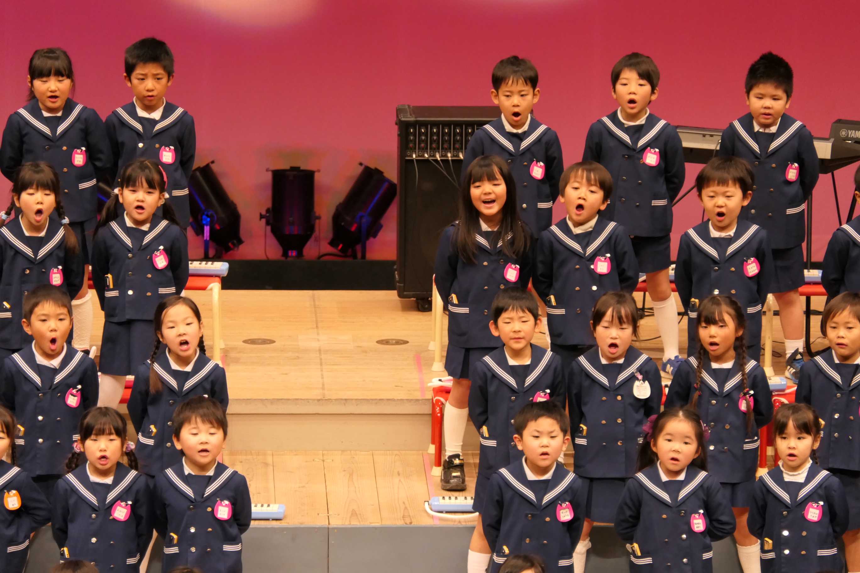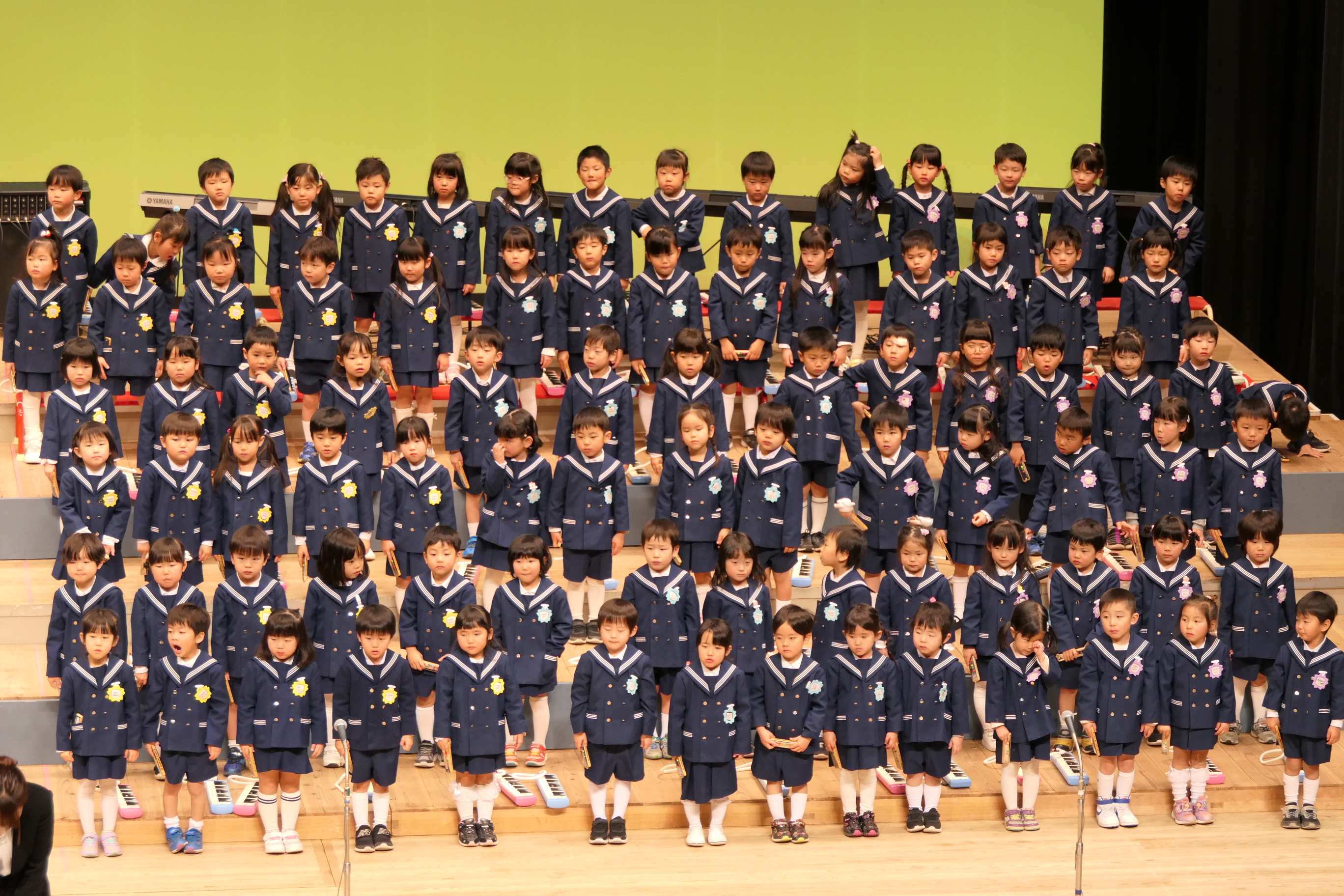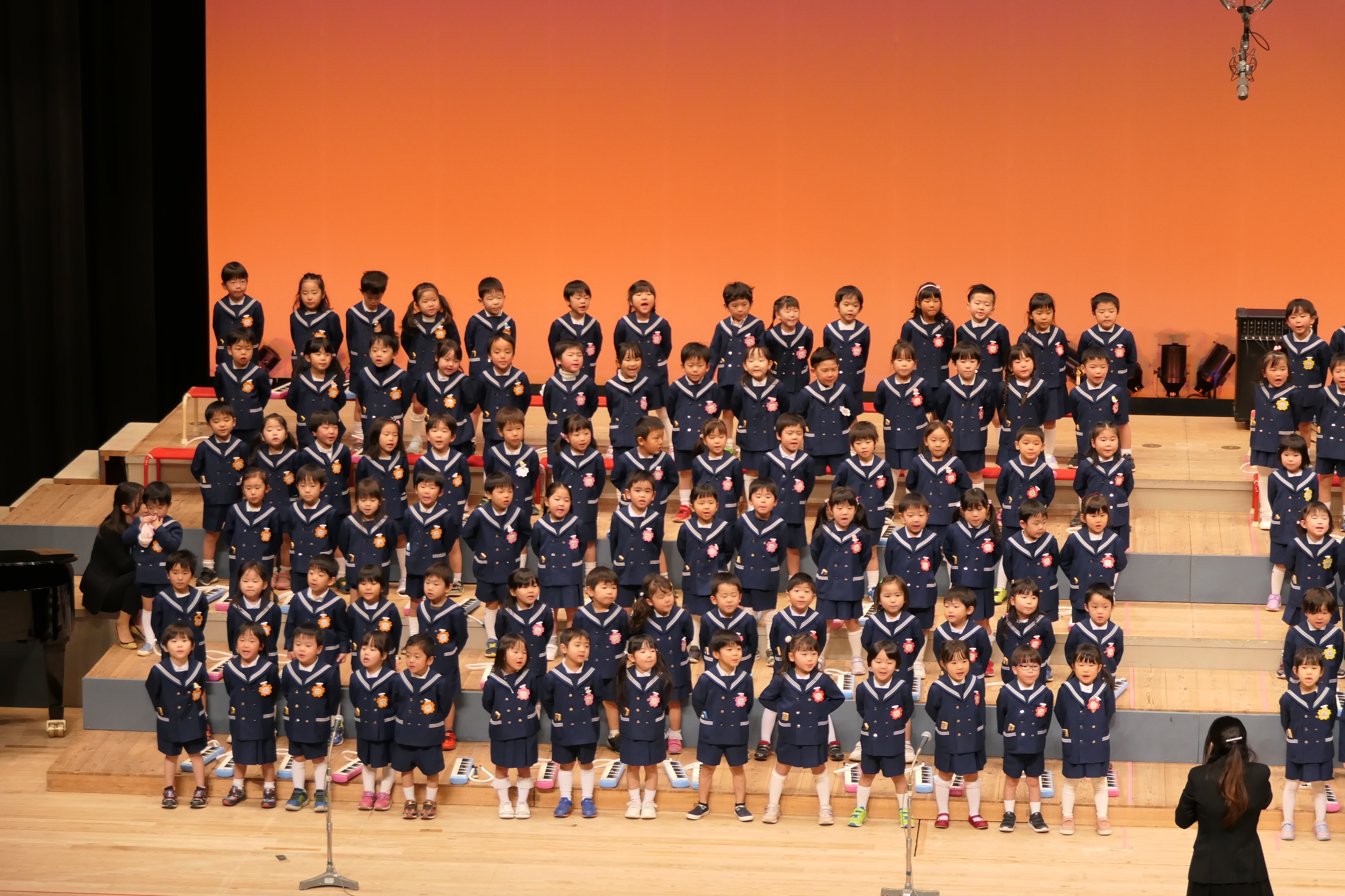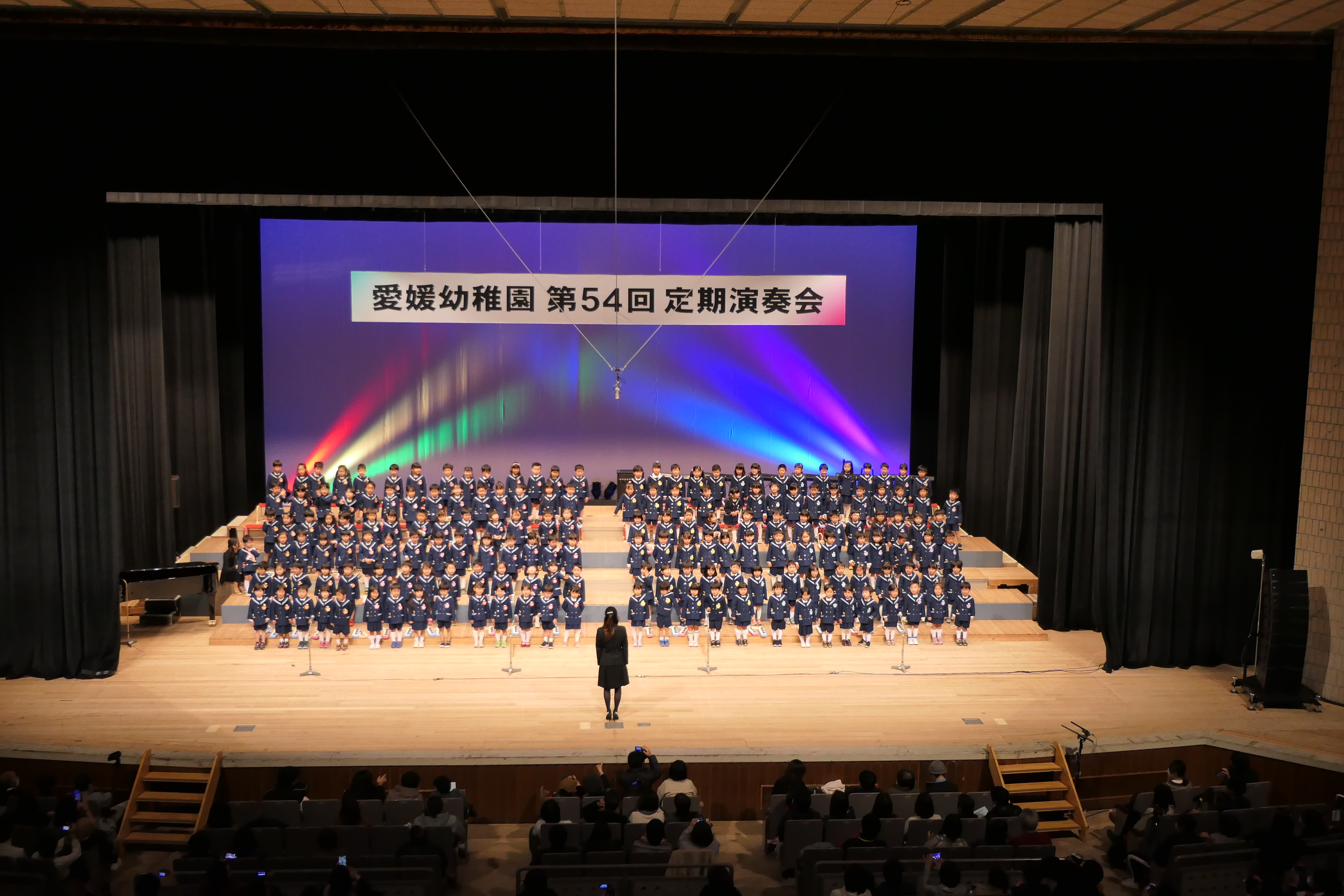 市民会館の大ホールで、みんな元気いっぱい歌い、リズムをとり、楽器を演奏しました。ちょっぴり緊張したけど、楽しかった!