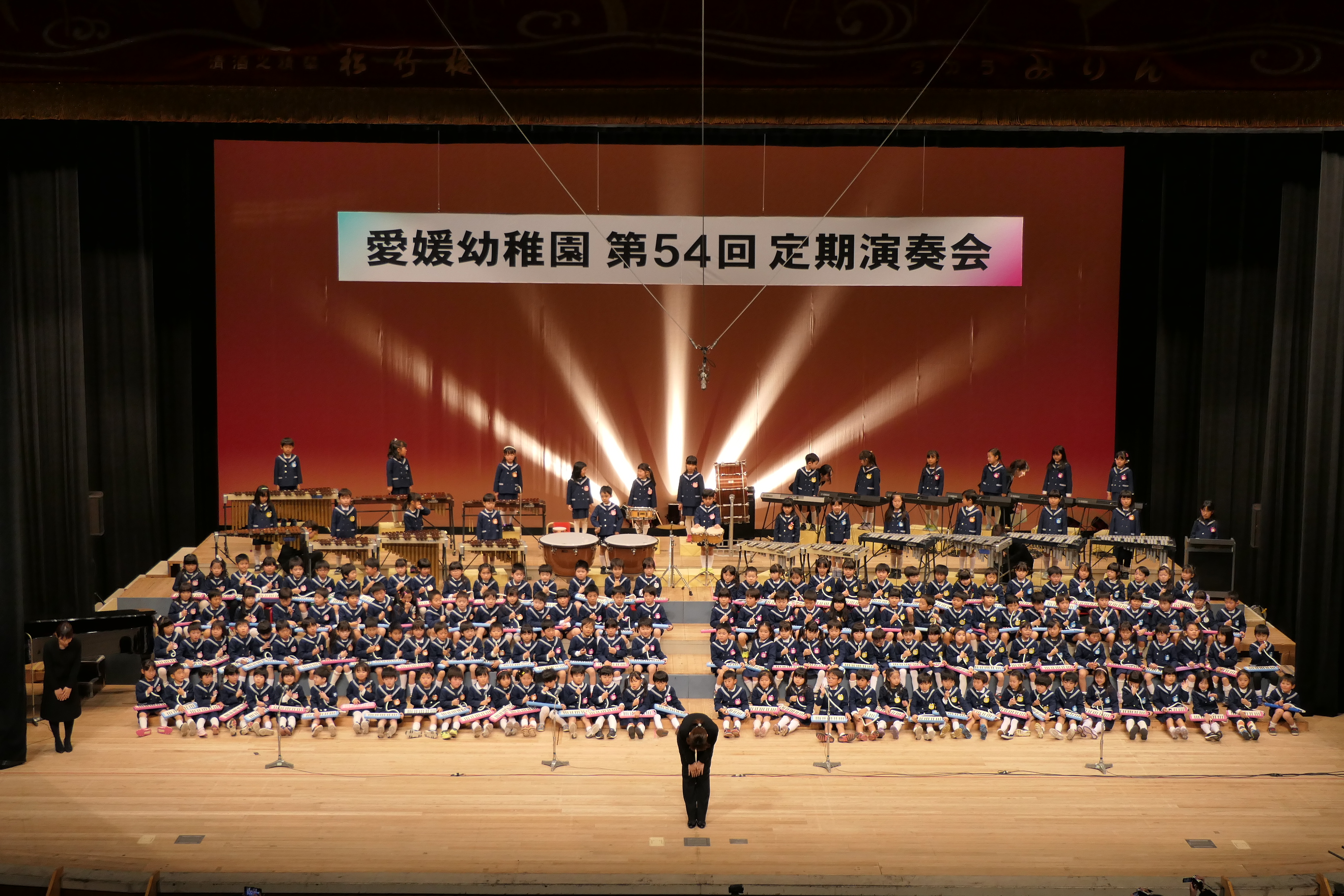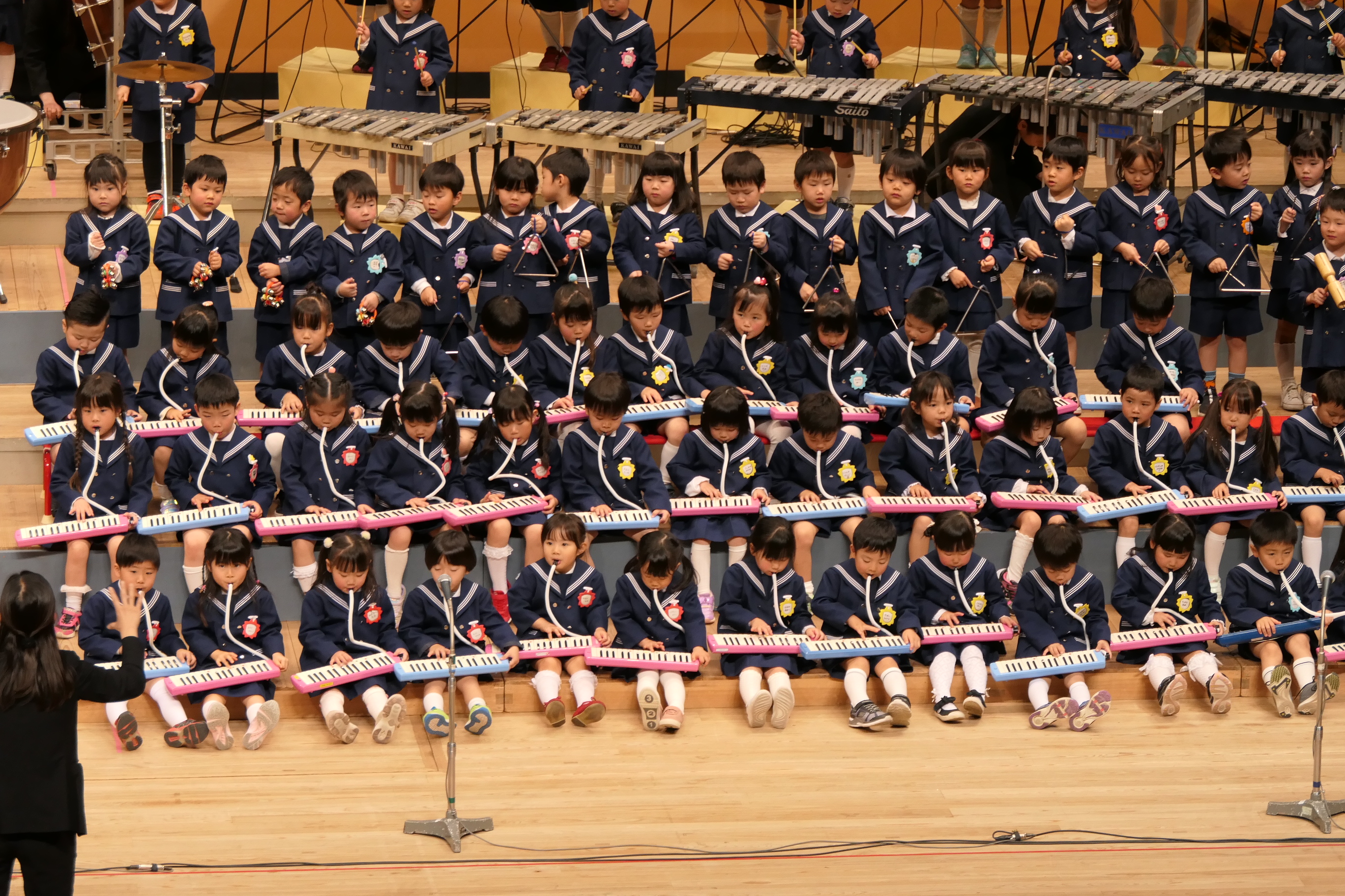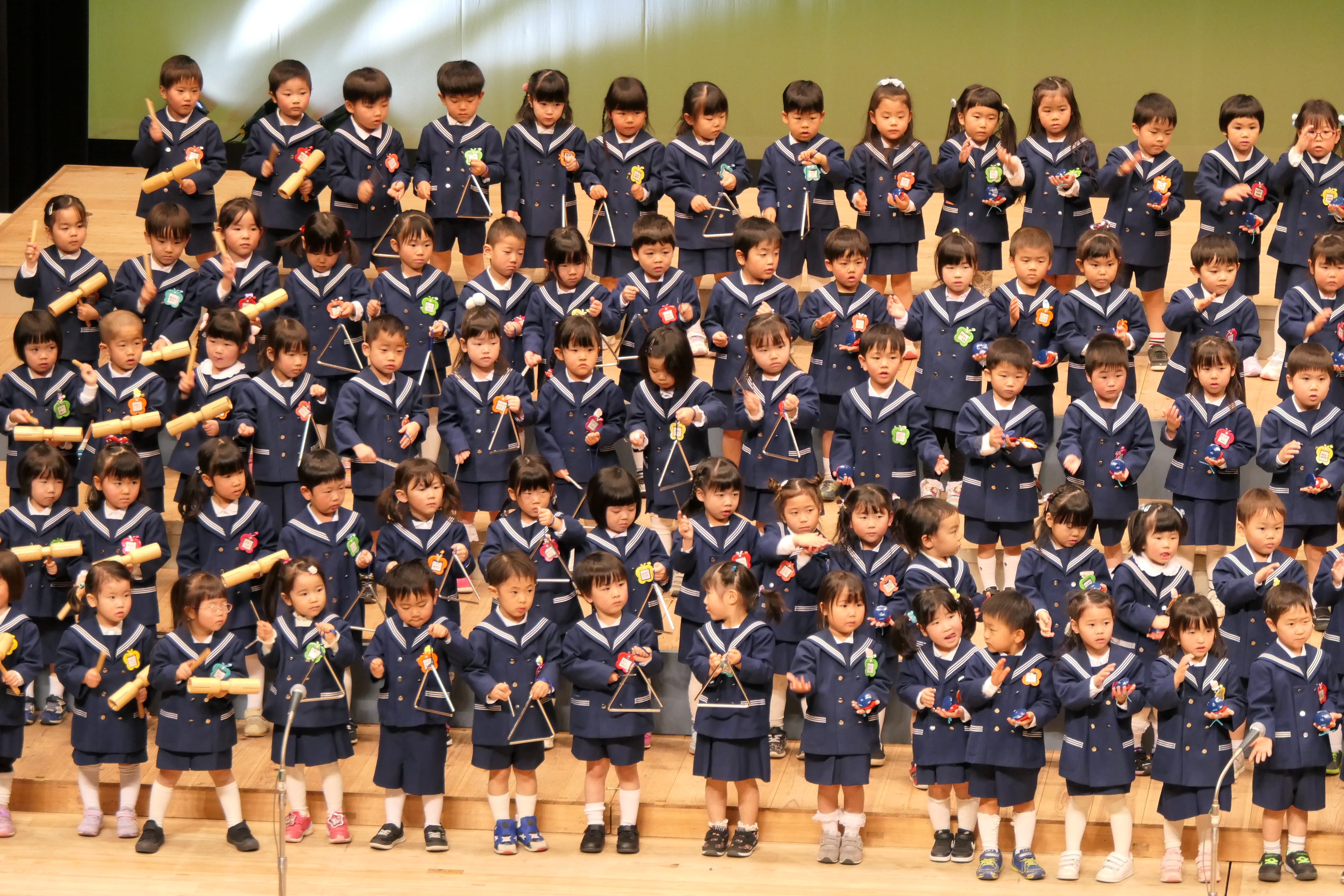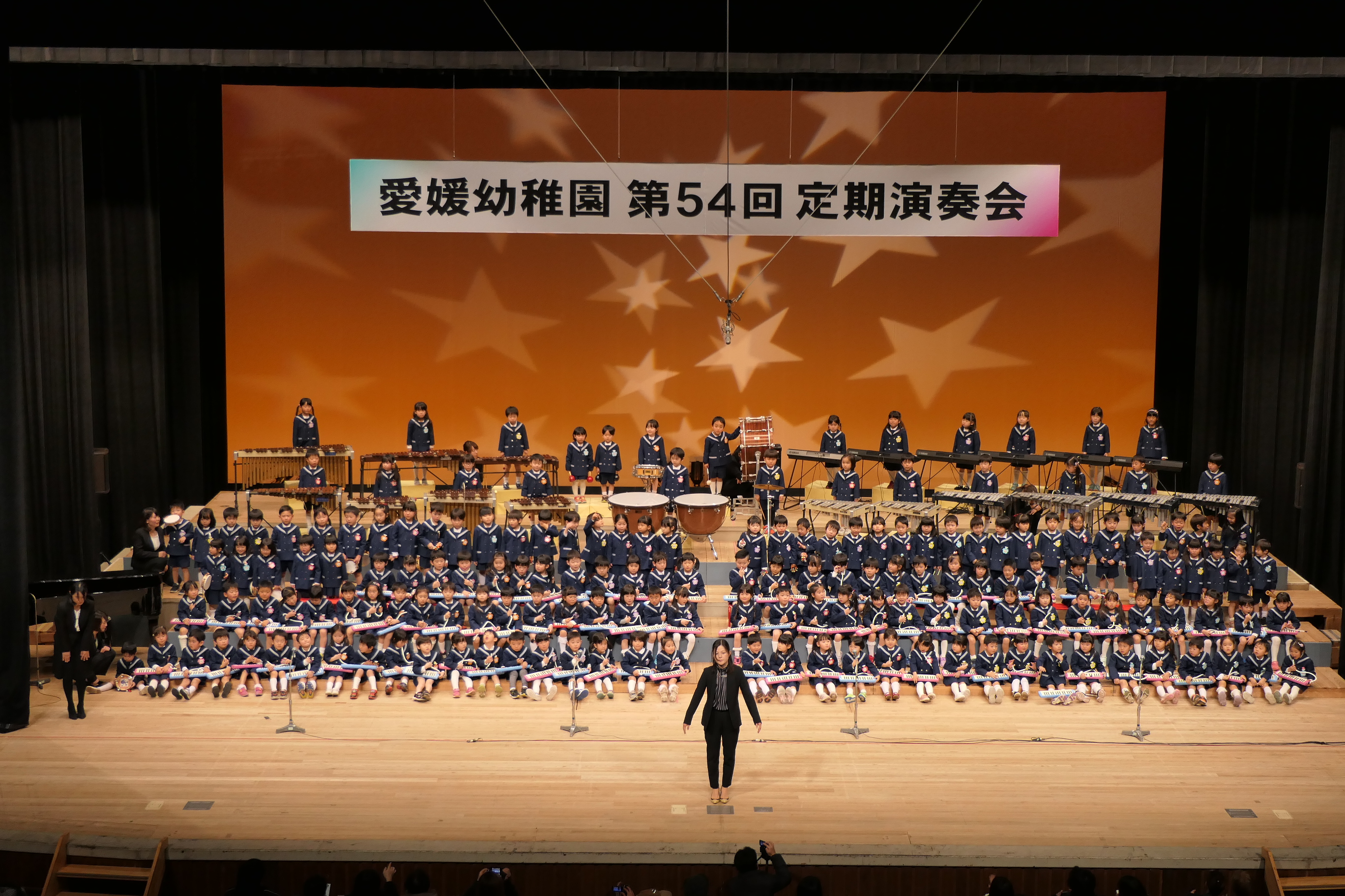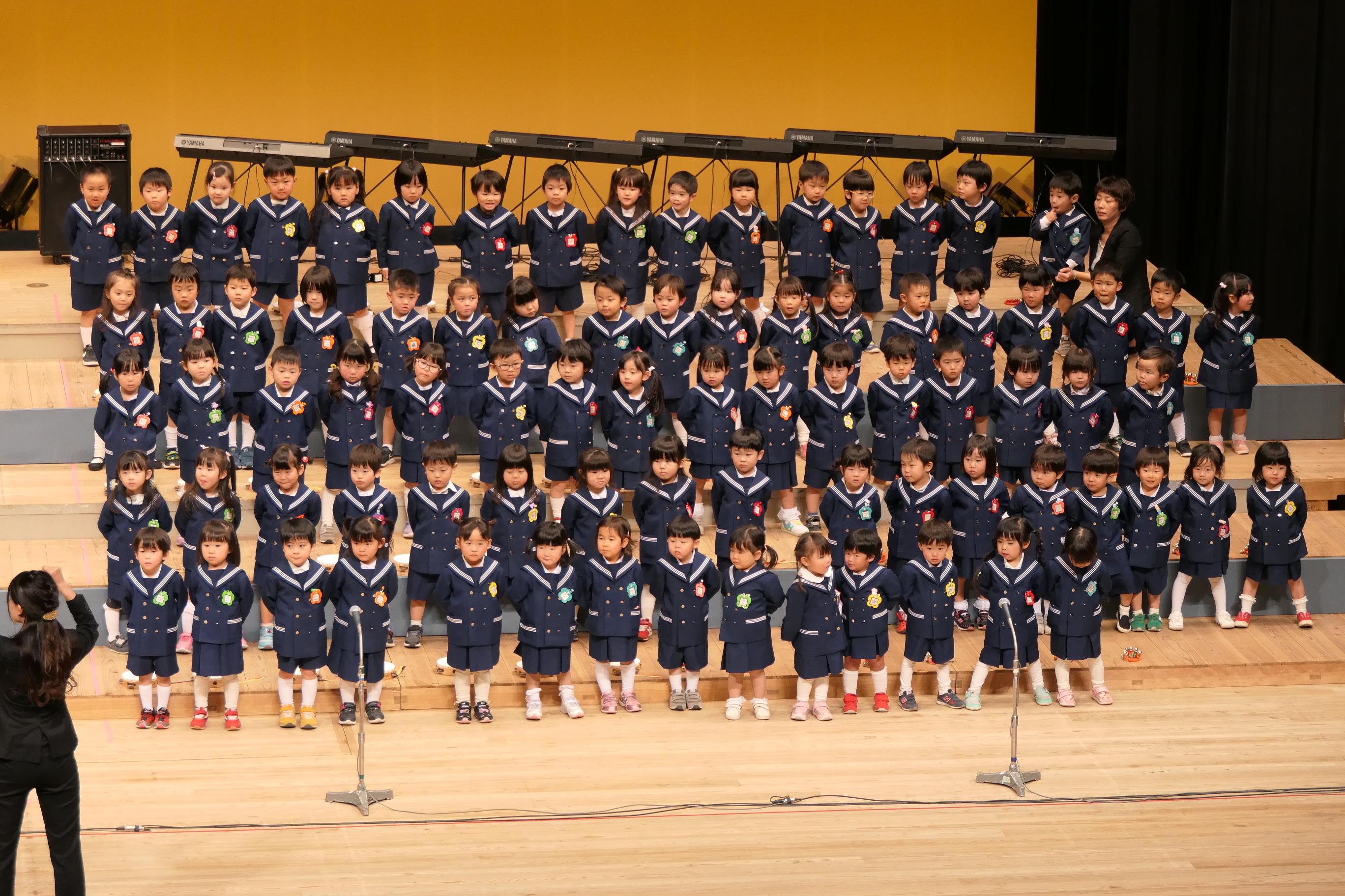市民会館の大ホールで、みんな元気いっぱい歌い、リズムをとり、楽器を演奏しました。ちょっぴり緊張したけど、楽しかった!