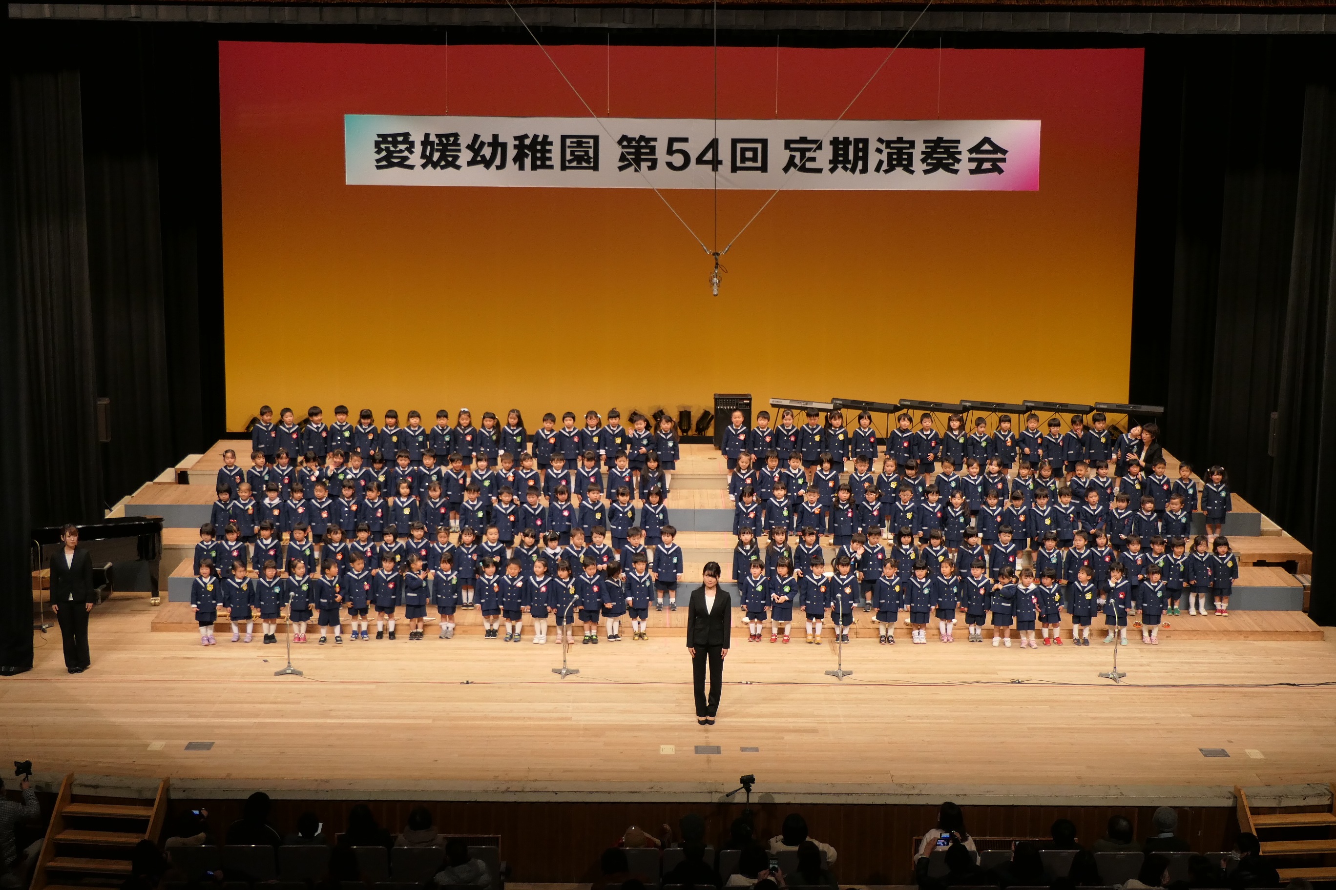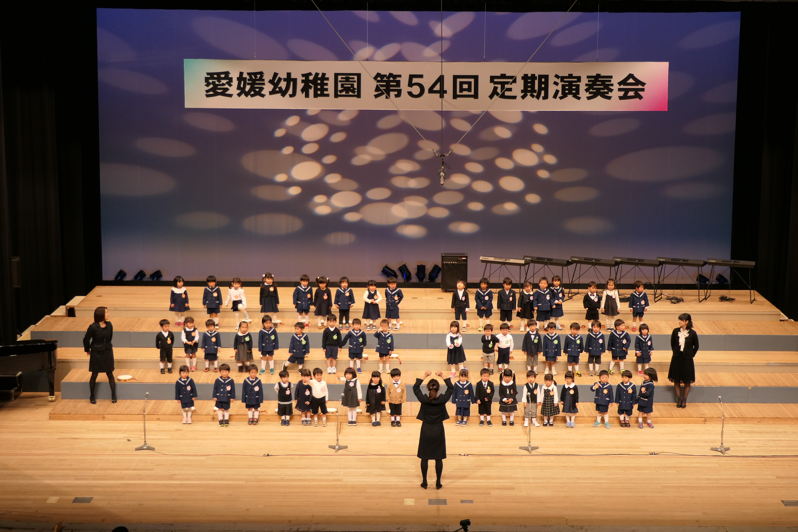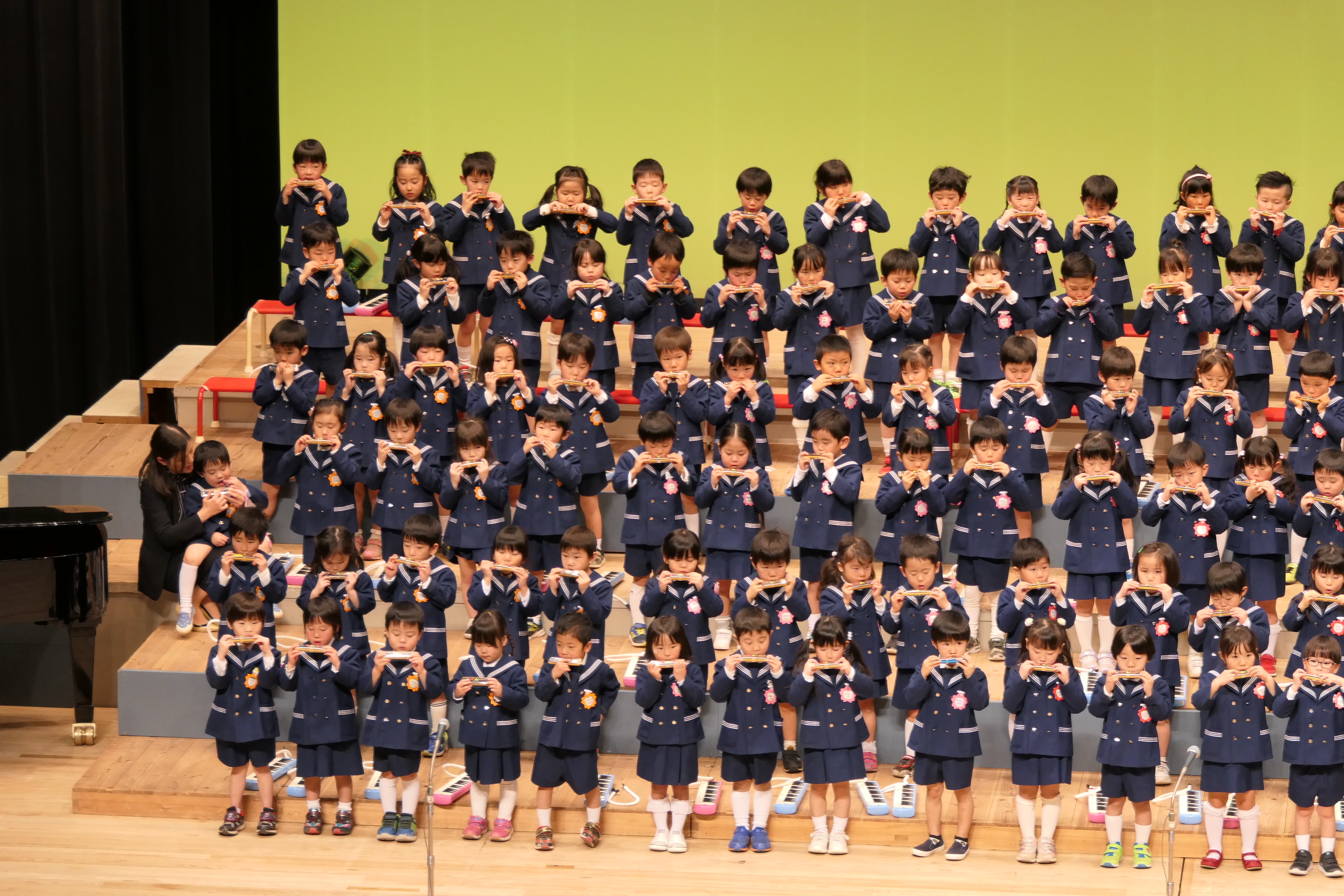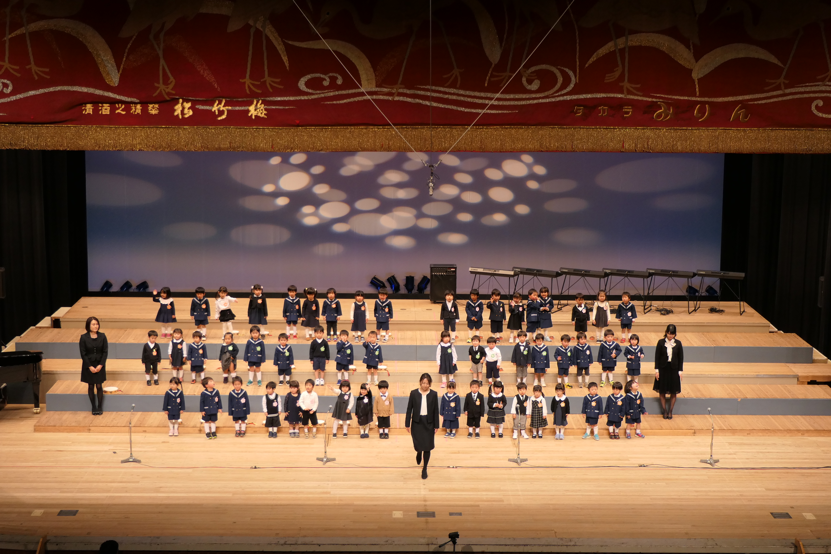 市民会館の大ホールで、みんな元気いっぱい歌い、リズムをとり、楽器を演奏しました。ちょっぴり緊張したけど、楽しかった!
