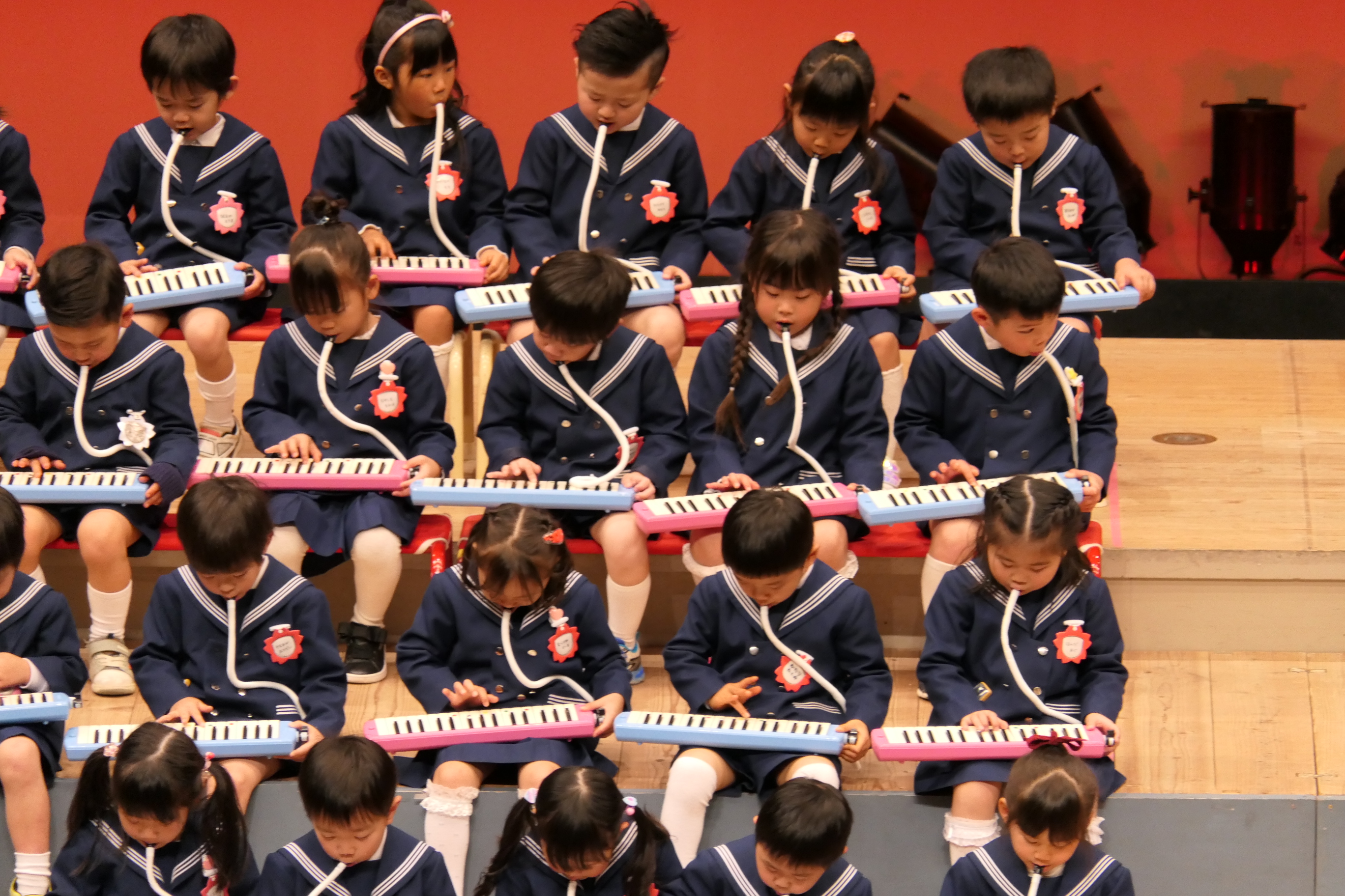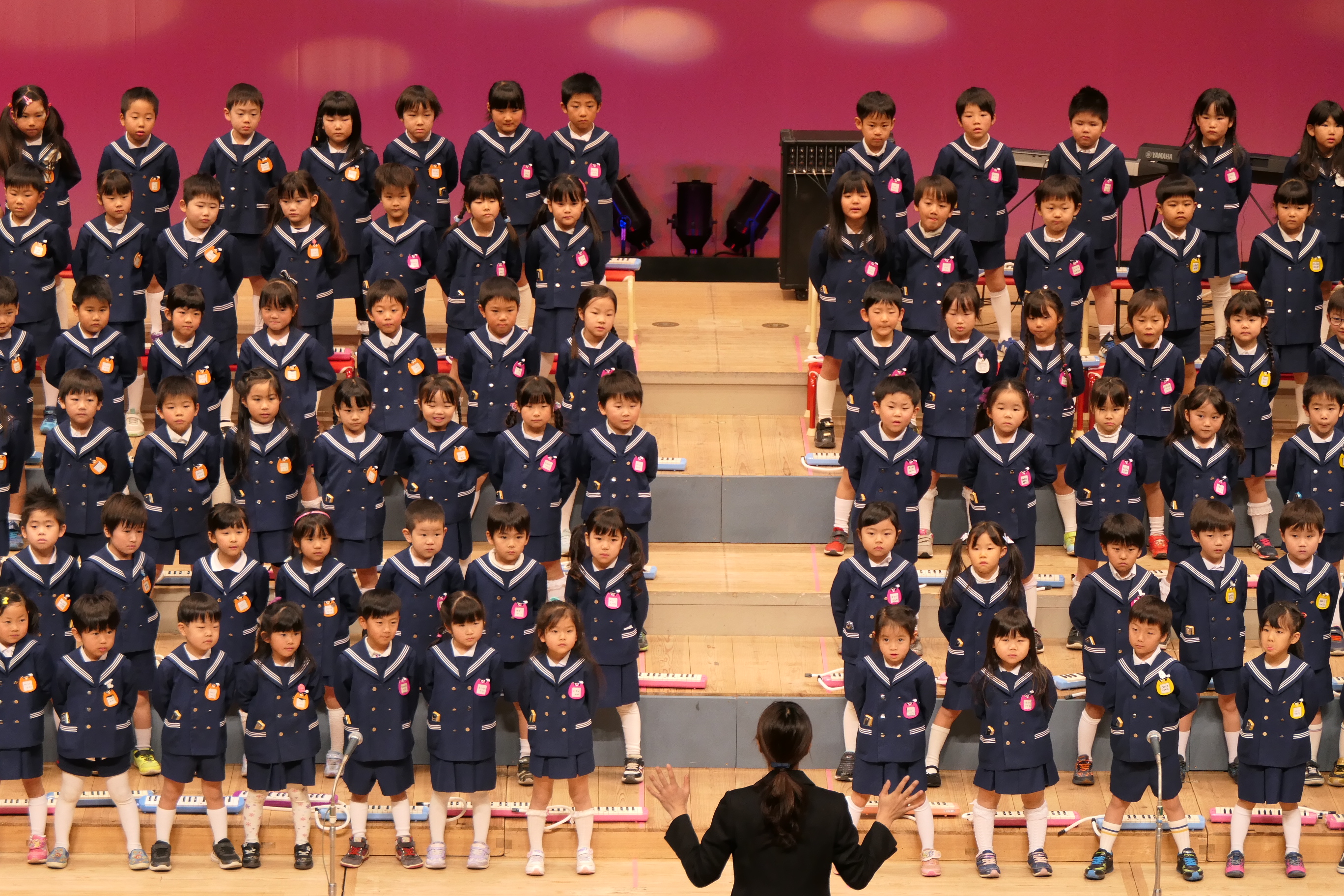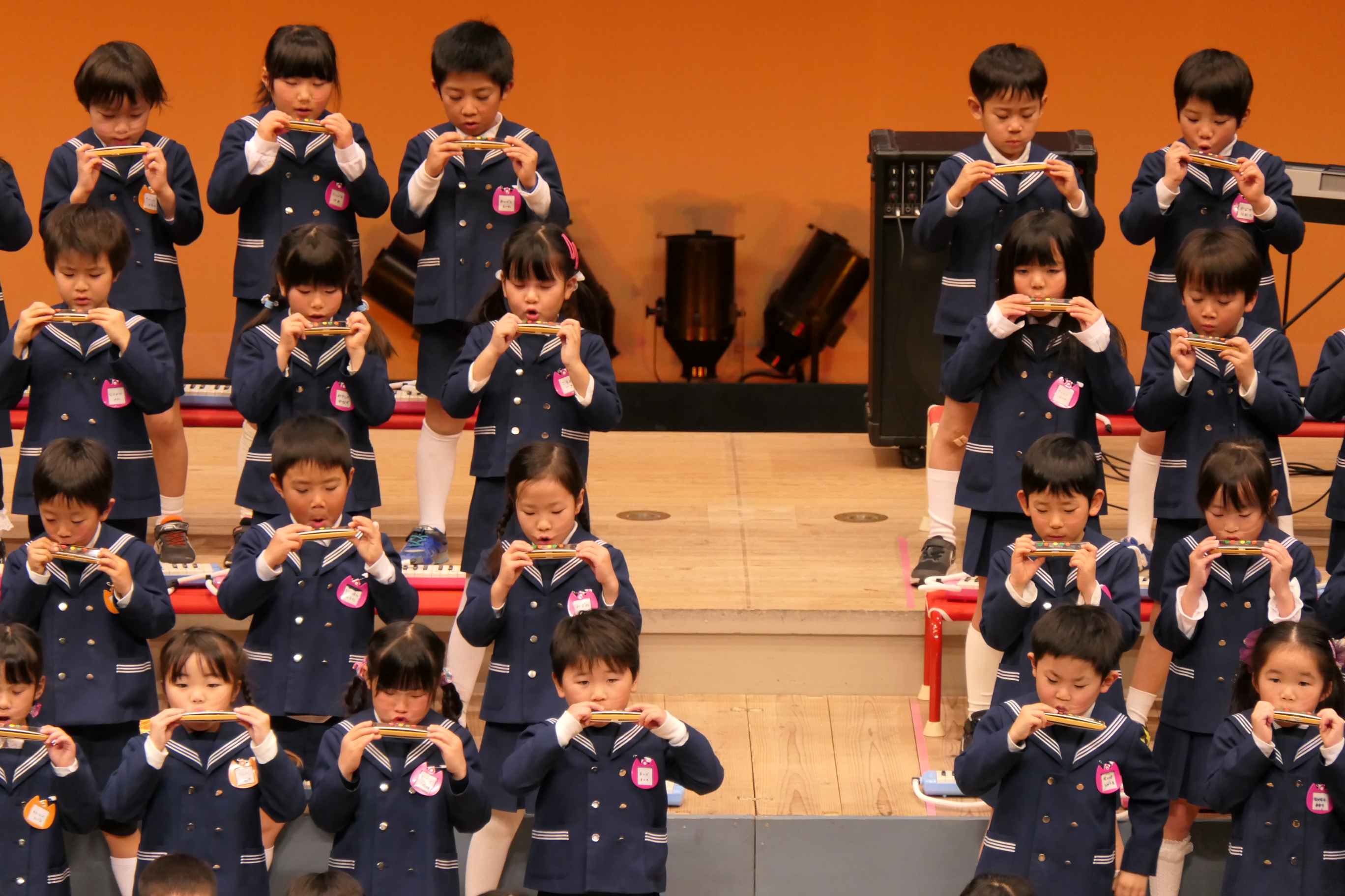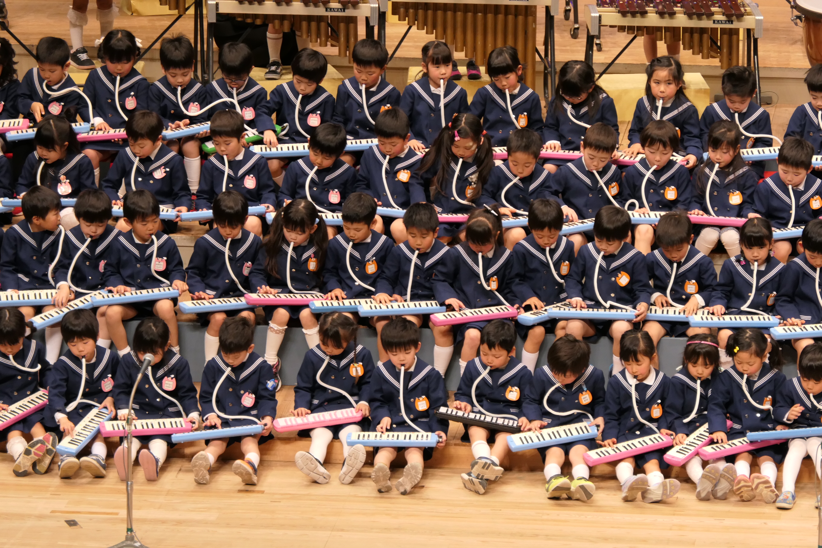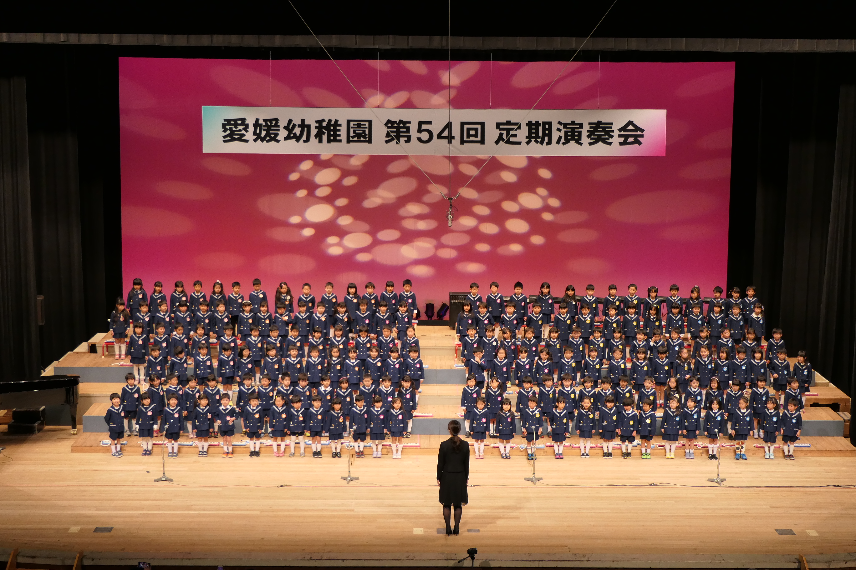 市民会館の大ホールで、みんな元気いっぱい歌い、リズムをとり、楽器を演奏しました。ちょっぴり緊張したけど、楽しかった!