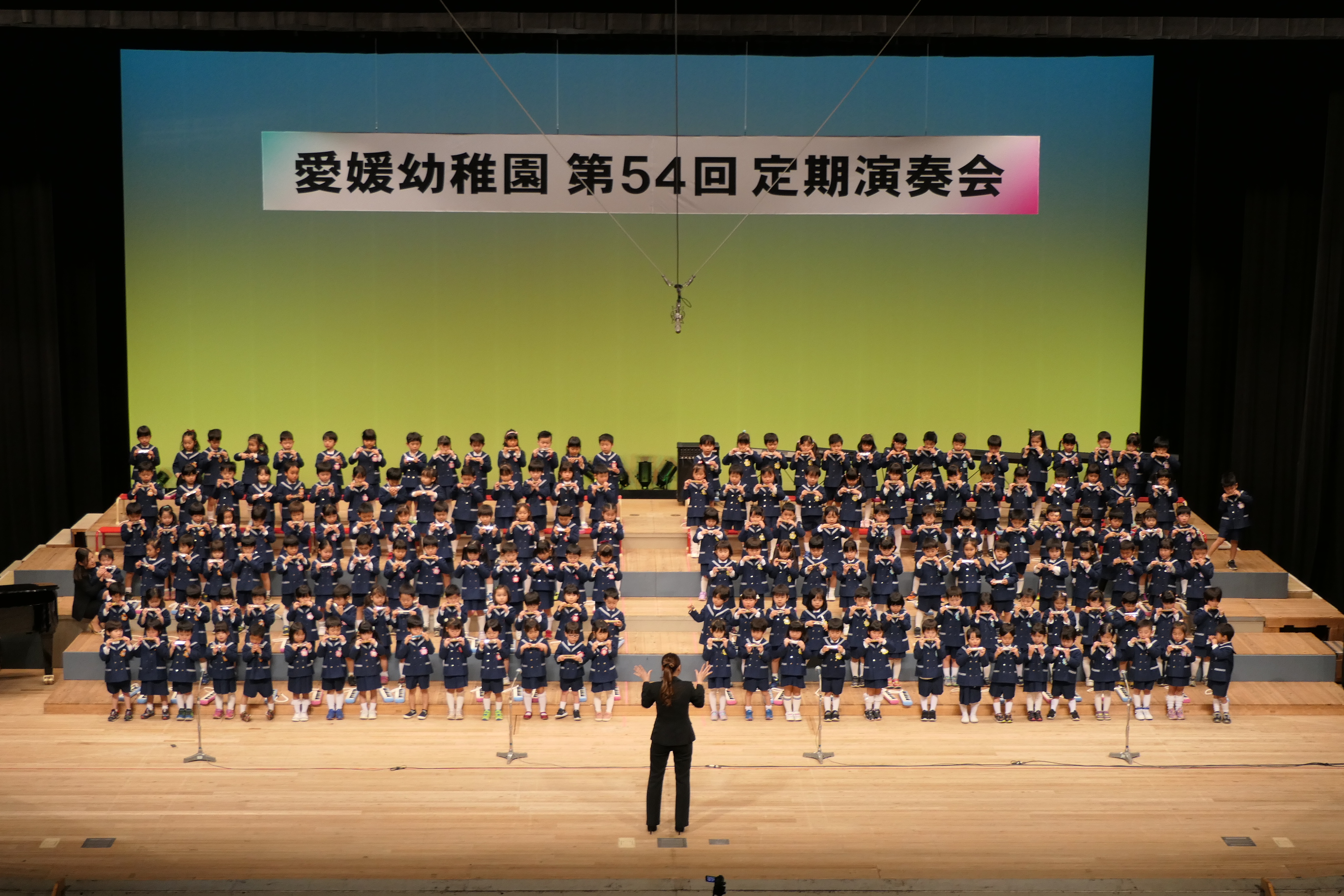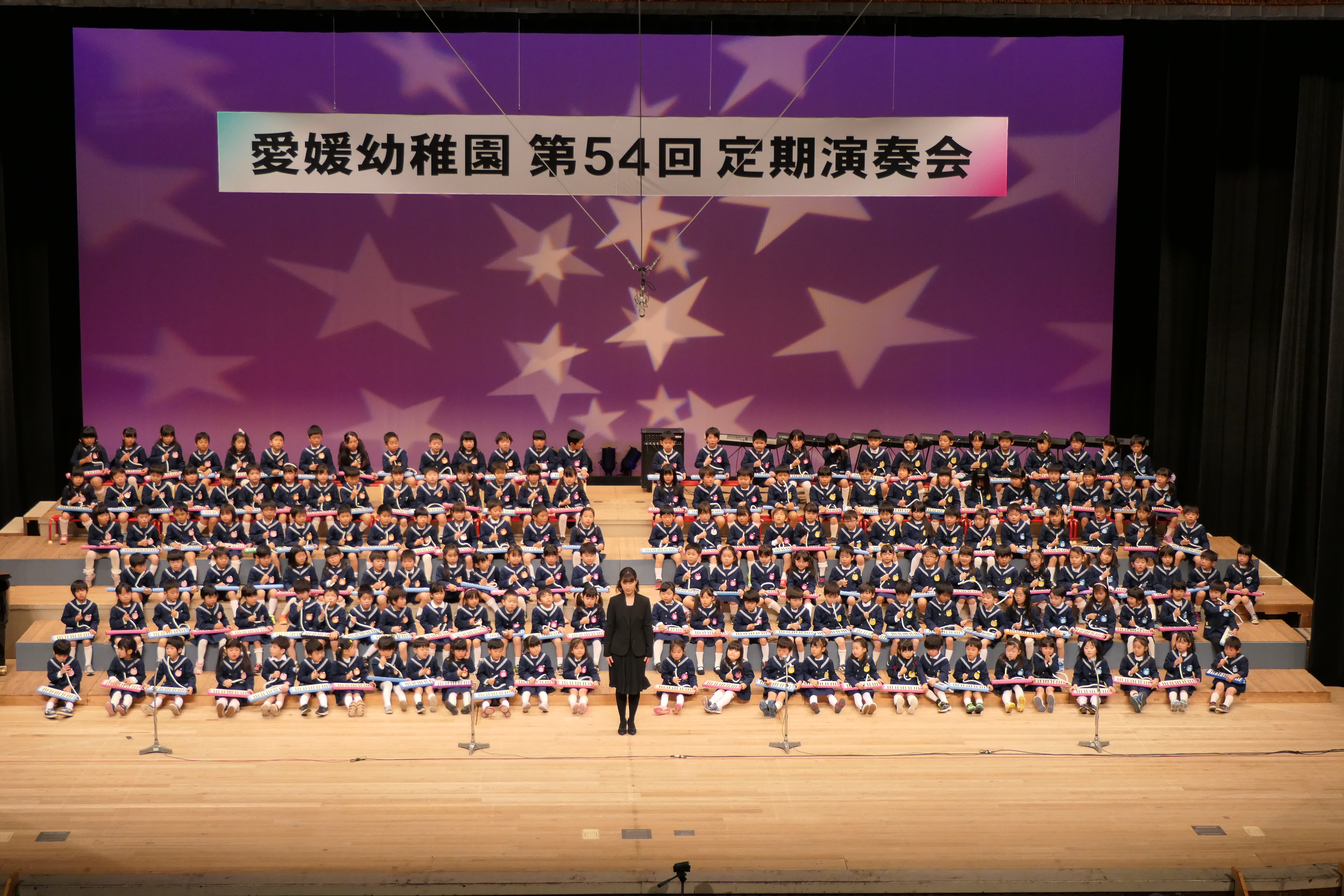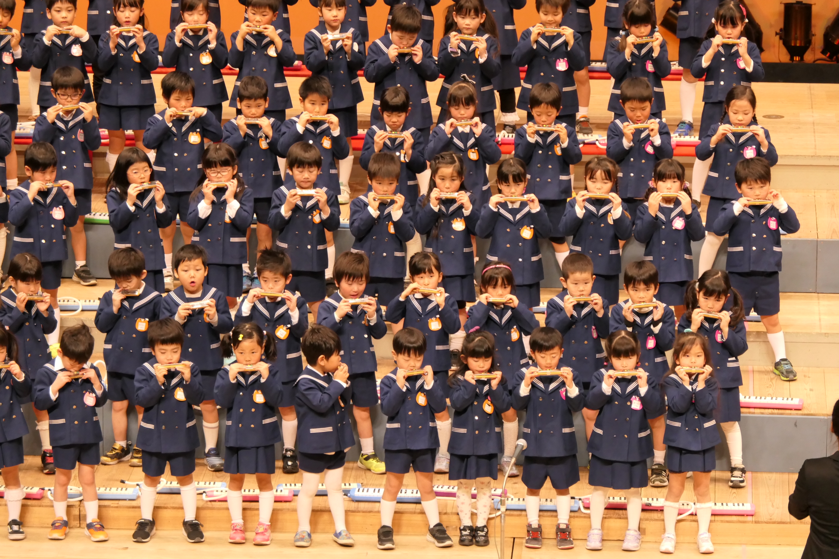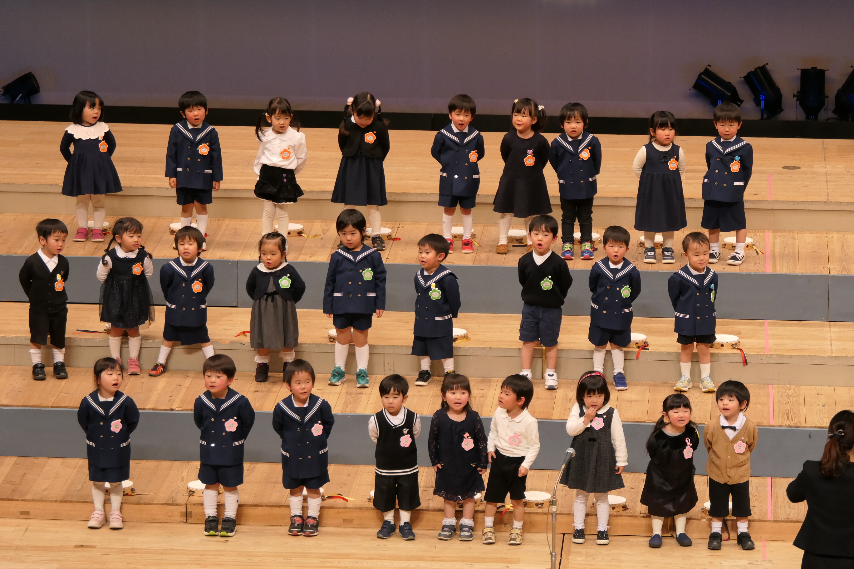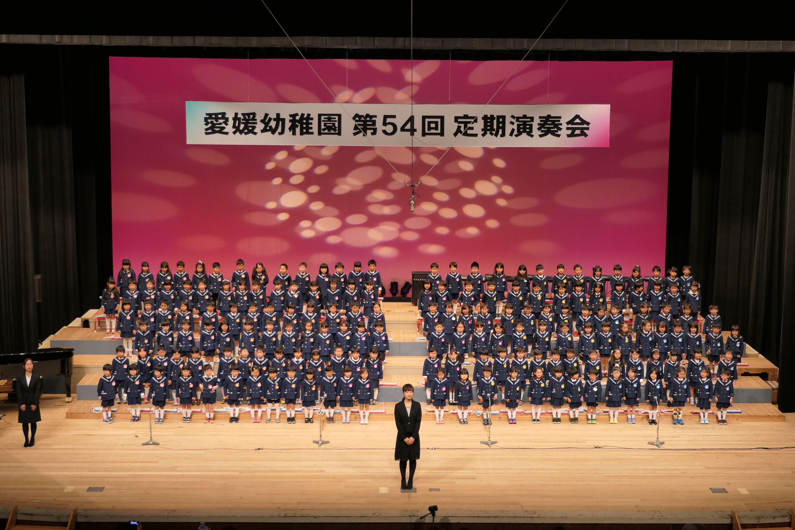 市民会館の大ホールで、みんな元気いっぱい歌い、リズムをとり、楽器を演奏しました。ちょっぴり緊張したけど、楽しかった!